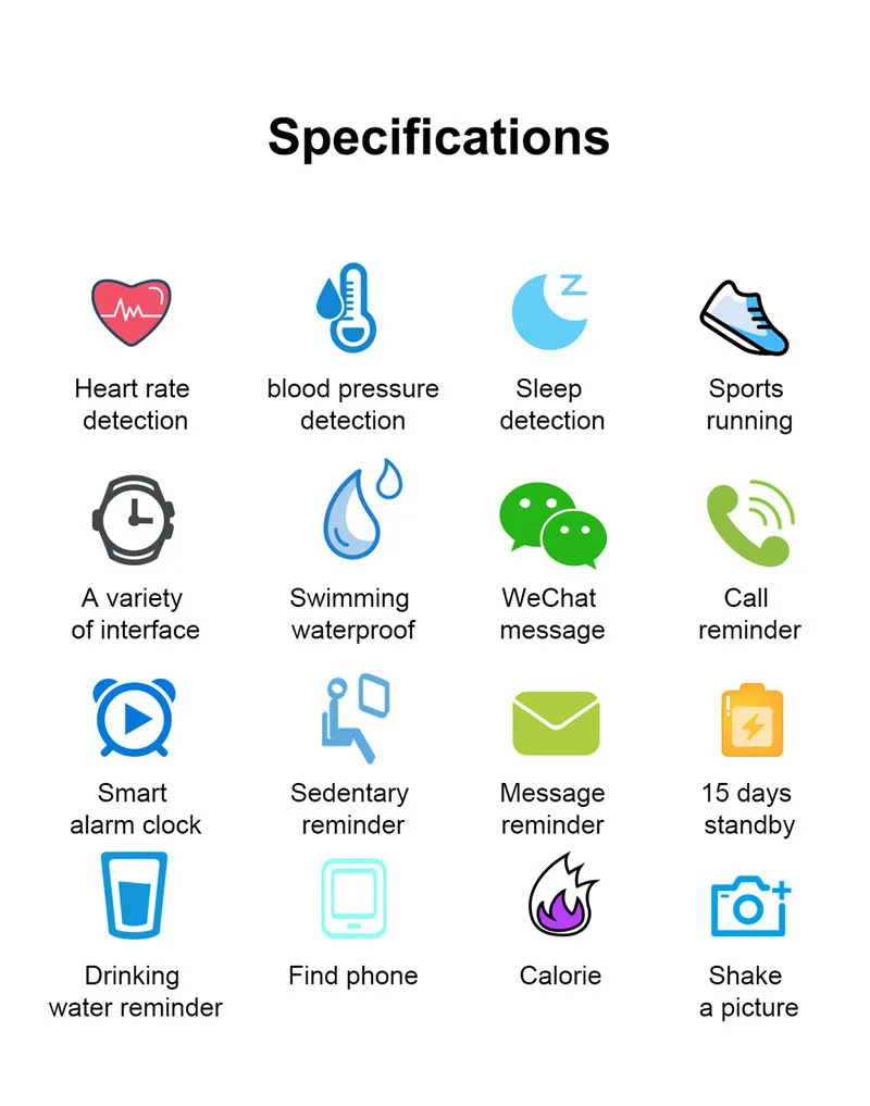 F6 смарт-браслет монитор сердечного ритма Водонепроницаемый Фитнес-трекер Bluetooth часы браслет для Android IOS женские мужские браслеты Описание: Шагомер, расстояние, калории, модель упражнений, монитор сердечного ритма, монитор артериального давления, Монитор кислорода в крови, монитор сна, напоминание о малоподвижности. Другие функции: Напоминание QQ, напоминание WeChat, напоминание о входящем звонке, SMS напоминание, будильник, удаленная камера, защита от потери, поиск браслета, синхронизация времени, поднимите руку, чтобы осветить экран. Параметры оборудования продукта: Тип экрана: 0,96 TFT цветной экран 80*160 Способ зарядки: зарядное устройство USB Параметры программного обеспечения: Системные требования: Android 4,4/IOS 8,0 Версия Bluetooth: 4,0 Поддерживаемые языки приложения: китайский, русский, хинди, немецкий, японский, французский, финский, английский, португальский, испанский, арабский, корейский, тайский, малайский Примечание: умный Браслет не предназначен для медицинского использования, пожалуйста, не покупайте его для проверки здоровья (проблемы с сердцем, проблемы с кровяным давлением), непрофессиональное использование. Только для справки. Упаковочный лист: 1 * умный Браслет 1 * Руководство пользователя