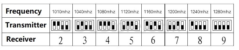 Частотная Таблица приемника: КаналЧастотаКаналЧастотаКаналЧастотаCH00,910 гCH10,980 гCH21,010 гCH31,040 гCH41,080 гCH51,120 гCH61,160 гCH71,200 гCH81,240 гCH91,280 гCH101,320 гCH111,360 г