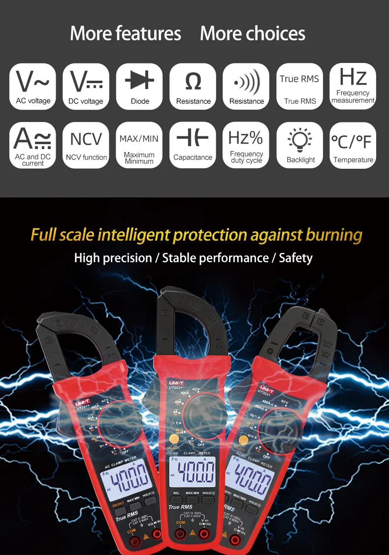 UT202A + 600V AC DC измерение напряжения, 600A AC Измерение тока, Макс/мин/true RMS Функция: AC/DC напряжение, AC Измерение тока, диодный тест, сопротивление, непрерывный зуммер, AC Frenquency, подсветка