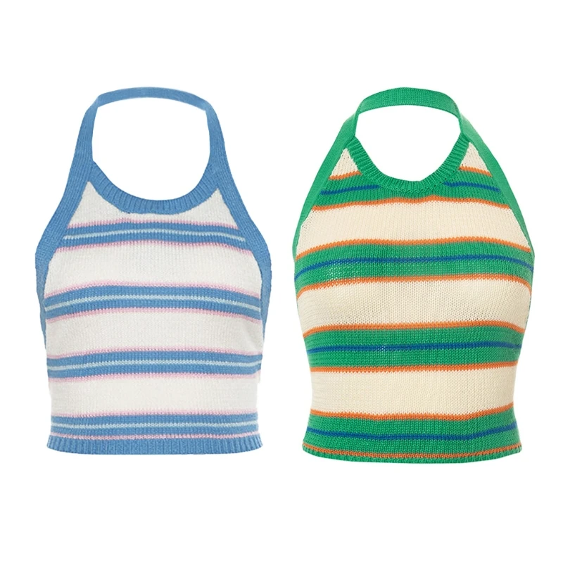 Контрастный разноцветный полосатый узор, облегающий крой, короткая укороченная длина, вязаный мини-жилет.