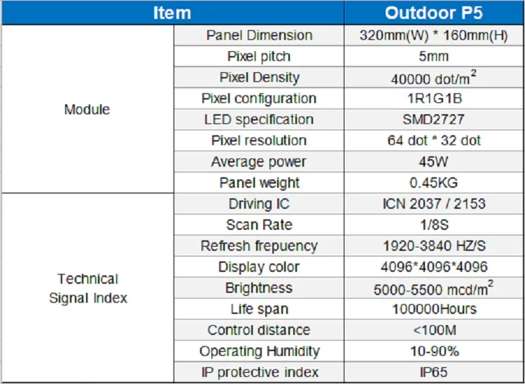 Примечание: цена включает P5 320 мм x 160 мм наружный светодиодный модуль, кабель передачи данных и кабель питания. У нас также есть светодиодные модули 160 мм x 160 мм P5.