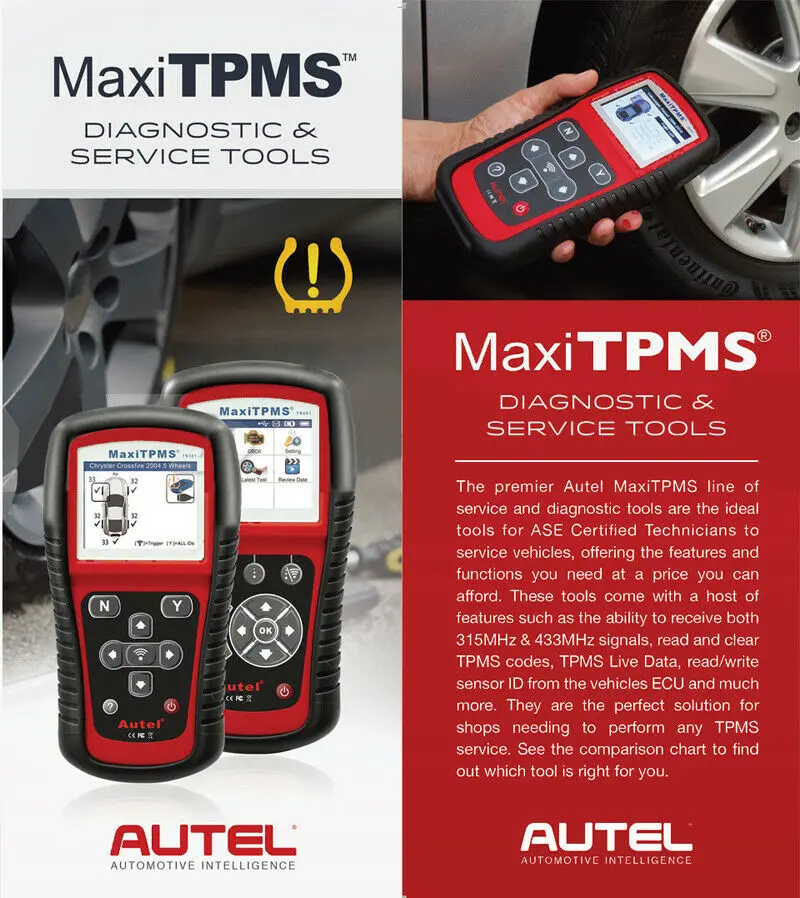 MaxiTPMS TS501 способен беспроводно диагностировать проблемы TPMS, а также активировать любые известные OEM/Универсальные датчики TPMS, идентификационные Клон или перепрограммируемые датчики на ECU транспортного средства и выключить предупреждающие огни.