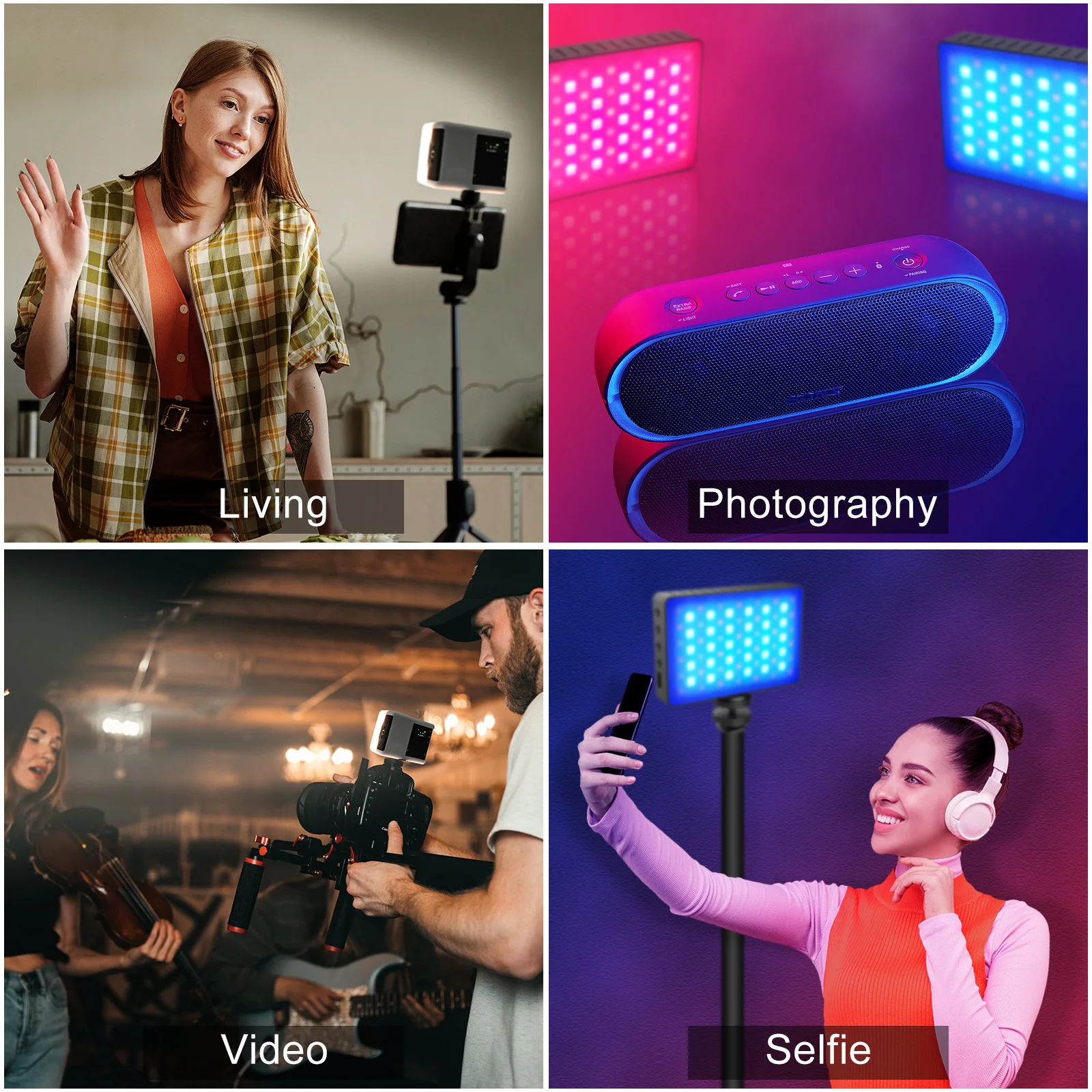 Для профессиональной фотосъемки используются 21 высокий индекс (белый + теплый белый) и 30 цветовых ламп RGB, низкое энергопотребление и точная цветовая температура.