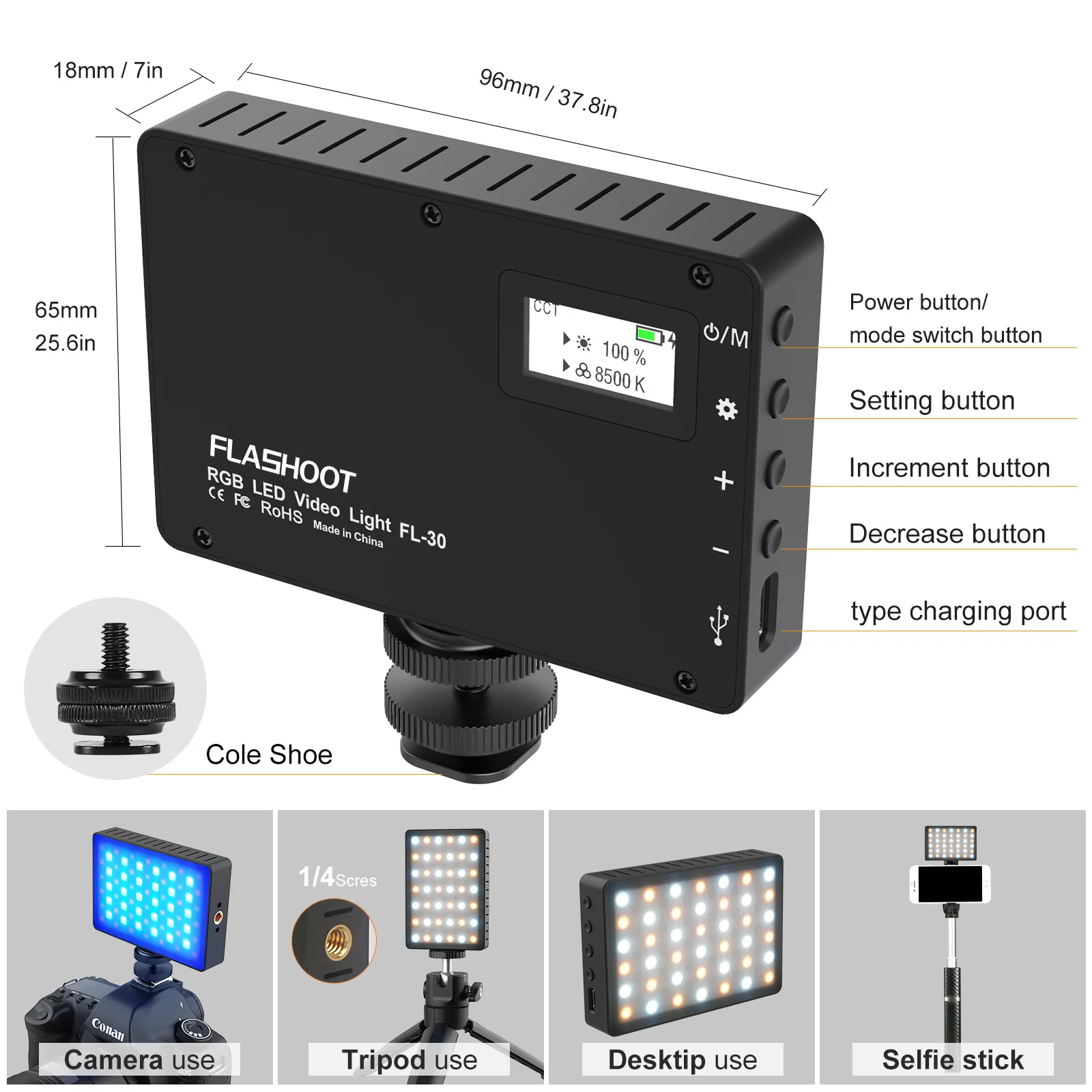 ▶[Светодиодный светильник RGB] светильник для камеры FLASHOOT FL-30 очень прост в установке. Вы можете легко регулировать цветовую температуру от 2800K до 8500K и яркость от 0% до 100%. RGB видео светильник принимает RGB 0-255 полный цвет, 10 видов эффектов сцены (светильник ing 1, светильник ing 2, кинотеатр, полиция, скорая помощь, пожарная машина, Быстрый RGB, SOS и светильник свечи). Встроенный oled-экран делает каждую регулировку четкой и простой в эксплуатации, что позволяет работать более эффективно.