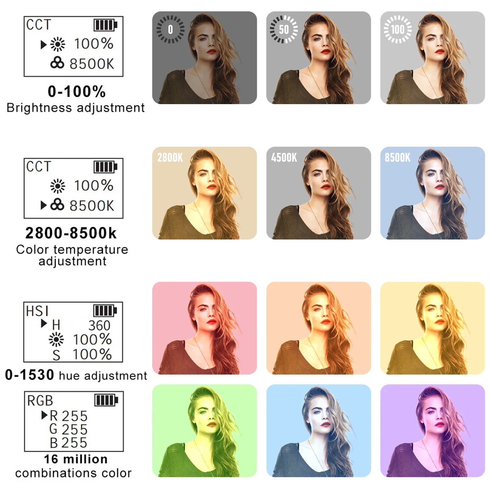 ▶[RGB полноцветный, CRI95 +, 10 сценических симуляций] светодиодный светильник для камеры с 72 светодиодный s (21 теплый белый + 21 холодный белый + 30 RGB), CRI≥ 95. Полноцветный RGB (диапазон оттенка от 0 до 360) имеет 2 режима работы RGB, до 16 миллионов комбинированных цветов, поддерживает чувствительную регулировку оттенка, яркости и насыщенности, И поддерживает 10 режимов сцены для удовлетворения различных требований к съемке.