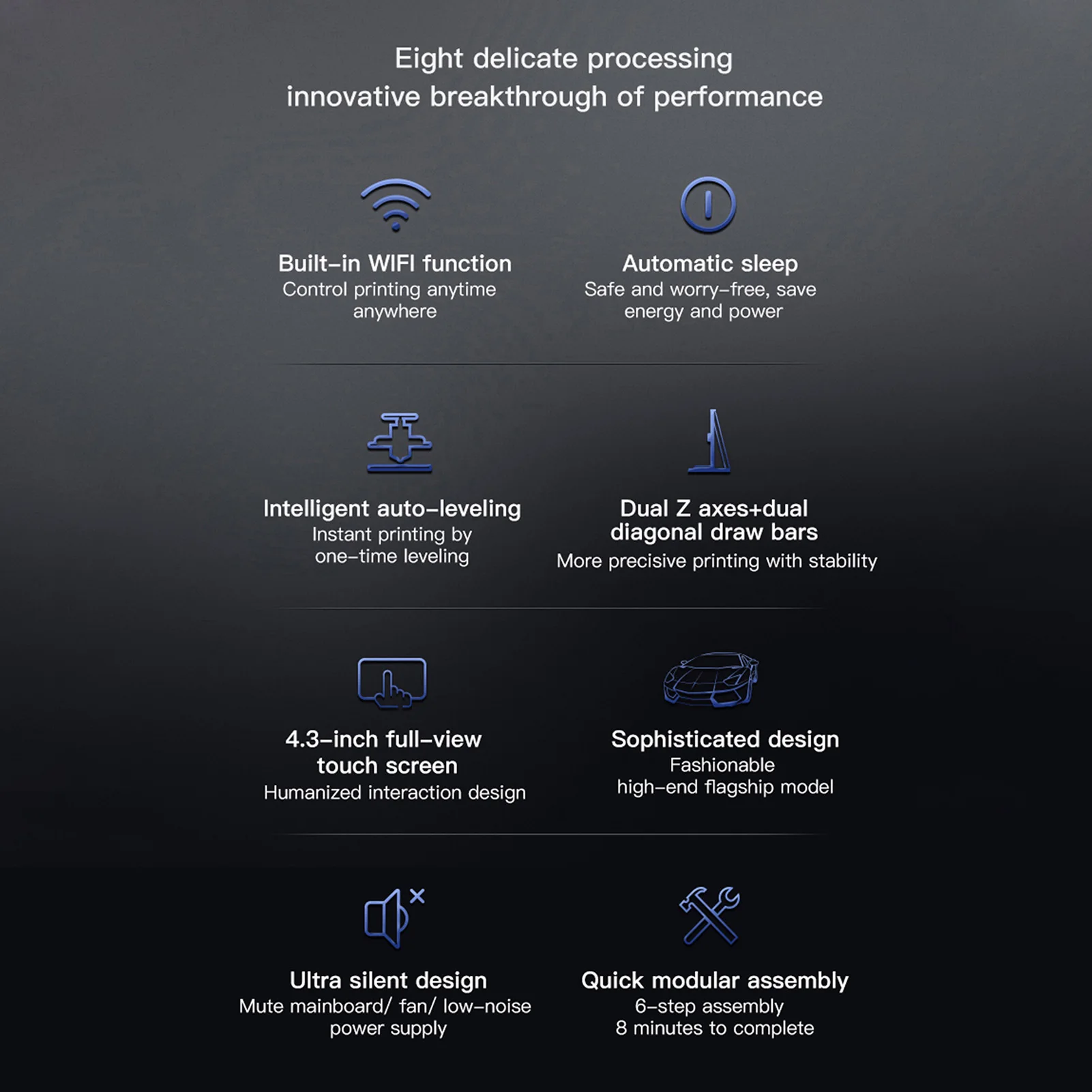 Быстрая сборка:Модульная конструкция, поддержка 8 минут сборки при первом использовании. Интеллектуальное автоматическое выравнивание, печать сразу после первого выравнивания и не беспокойтесь о трудоемком выравнивании, более удобное.