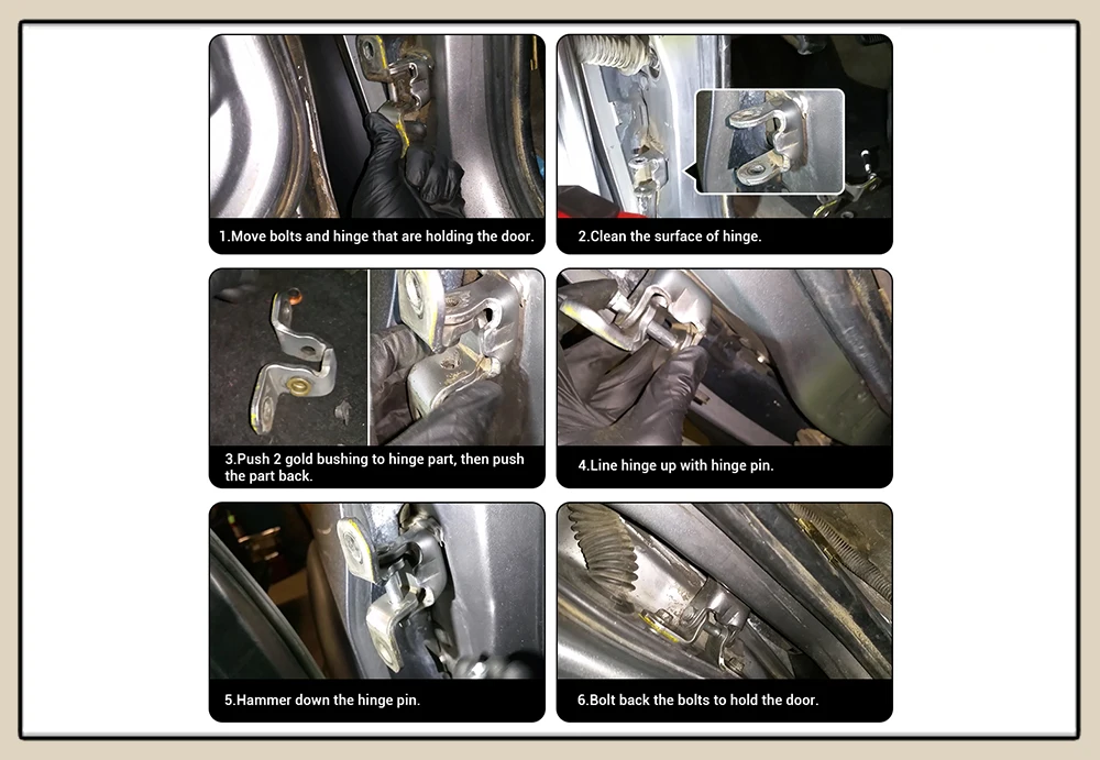 Перемещайте болты и петли, которые удерживают дверь.Очистите поверхность шарнира.Нажмите 2 золотые втулки для шарнирной части, затем нажмите на часть обратно.Линия петли с шарнирным штифтом.Отрежьте шарнирный штифт.Закрутите болты, чтобы держать дверь.Примечание:
