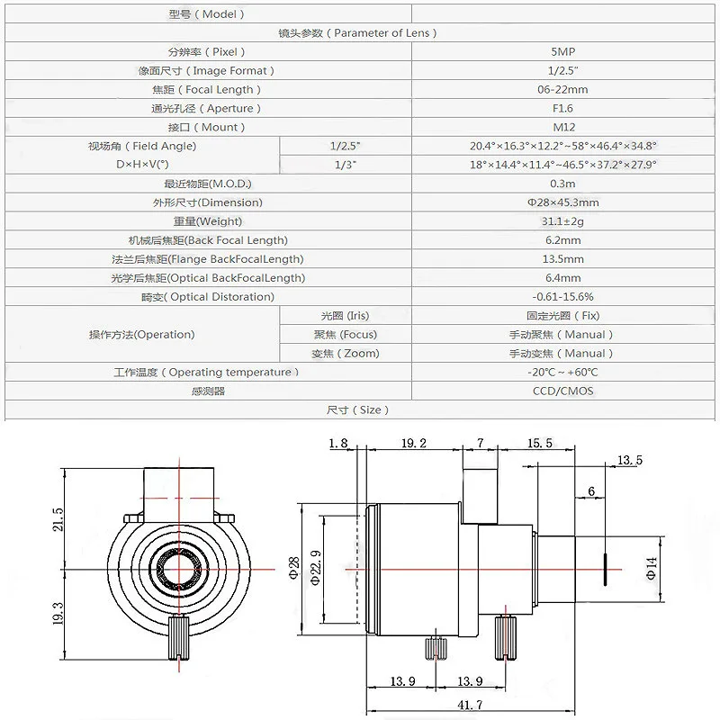Относительная Диафрагма (диафрагма D/f'): F1: 1,4Интерфейс (крепление): M12Формат изображения: 1/2.5Поле зрения (поле): 93-28,7Размеры: ¢ 28,6*44,8Оптическое Заднее фокусное расстояние BFL (мм): 6,5-13,5