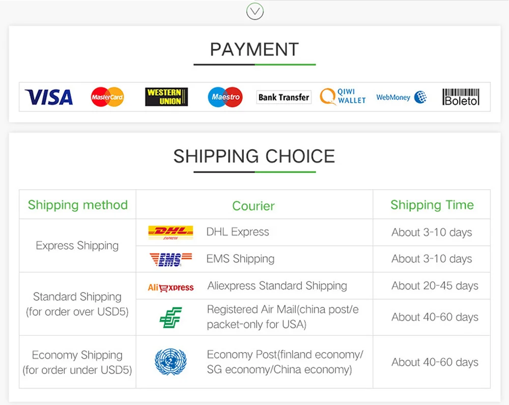 Мы предоставляем бесплатную доставку всеми способами доставки, такими как Авиапочта, DHL,EMS и т. д., зависит от страны назначения и объема заказа. Если вы хотите указать способ доставки, пожалуйста, Оплатите стоимость доставки, ниже приводится оценка скорости доставки для вашей справки. Спасибо вам