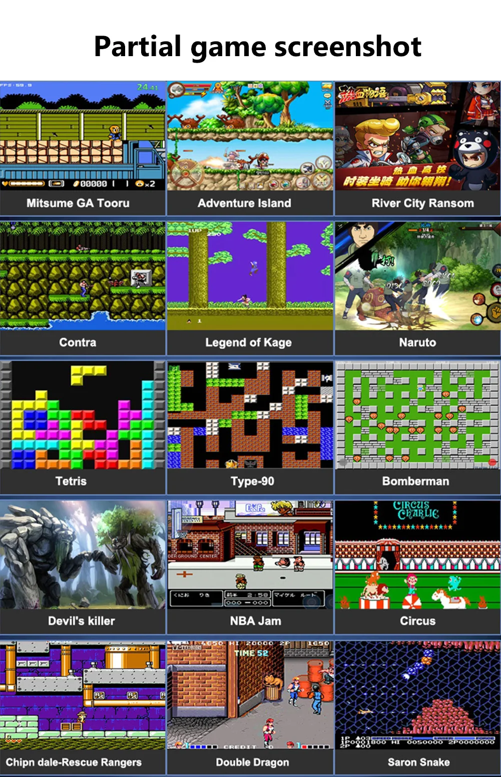 400/500/800 классические игры. Эта портативная игровая консоль обеспечивает множество ностальгических игр FC, включая 2D, спорт, гонки, стрельбу, боевые игры, подходящие для взрослых и детей. Это хороший шанс для вас, чтобы напомнить о своих детских Воспоминаниях и играть с вашими друзьями и ребенком.