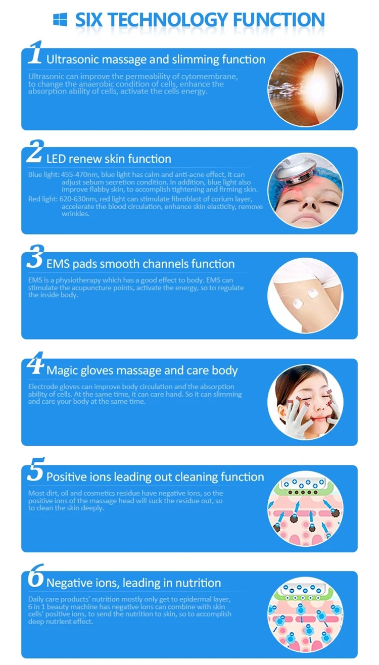 EMSМожет имитировать реальных людей, чтобы сделать постукивание, массаж, разминание, скраппинг, похудение с помощью микро-токового массажа, чтобы сделать мышечные упражнения, и потреблять окружающий жир, сахар и углеводы. Потребляйте до 3000-4000 джоулей в секунду, чтобы сделать ваше тело стройнее быстро и эффективно1 МГц ультразвуковойГлубокое содержание свинца в коже, использование высокочастотного вибрирующего, в сочетании с химическим и нагревательным эффектом, для уменьшения жира.Красный светильник:Длина волны 625 ± 3 Нм/12 светодиодов активирует клетки, способствует выработке коллагена, удаляет морщины глаз и мешочек для глаз.Синий светильник:Длина волны 465 ± 3нм/12 светодиодов, уменьшает воспаление, устраняет акне, баланс воды и масла для жирной кожи, очень подходит для жирной кожи, акне кожи и чувствительной кожи.Положительный ионный вывод:В соответствии с принципом привлечения противоположных зарядов используйте устройство, чтобы полностью очистить грязные и черные головки, которые скрыты в глубоких порахОтрицательная ионная свинцовая:В соответствии с принципом снятия зарядов Используйте устройство для глубокого питания кожи и прекрасно впитывайте питание на 100%.Технические характеристики: