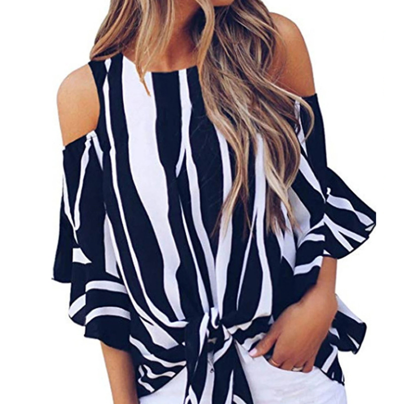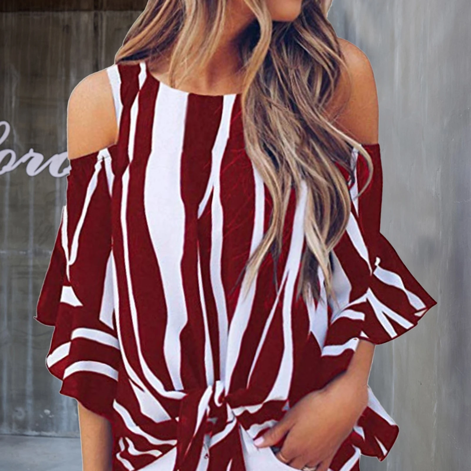 Женская шифоновая рубашка с принтом в полоску, круглым вырезом, открытыми плечами, рюшами и полурукавами, с бантом, в модном, элегантном и сексуальном стиле.