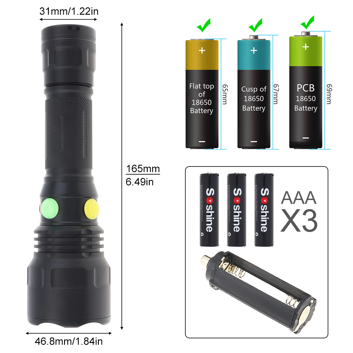 Тип батареи: 1x18650 или 3x AAA (не входит в комплект)