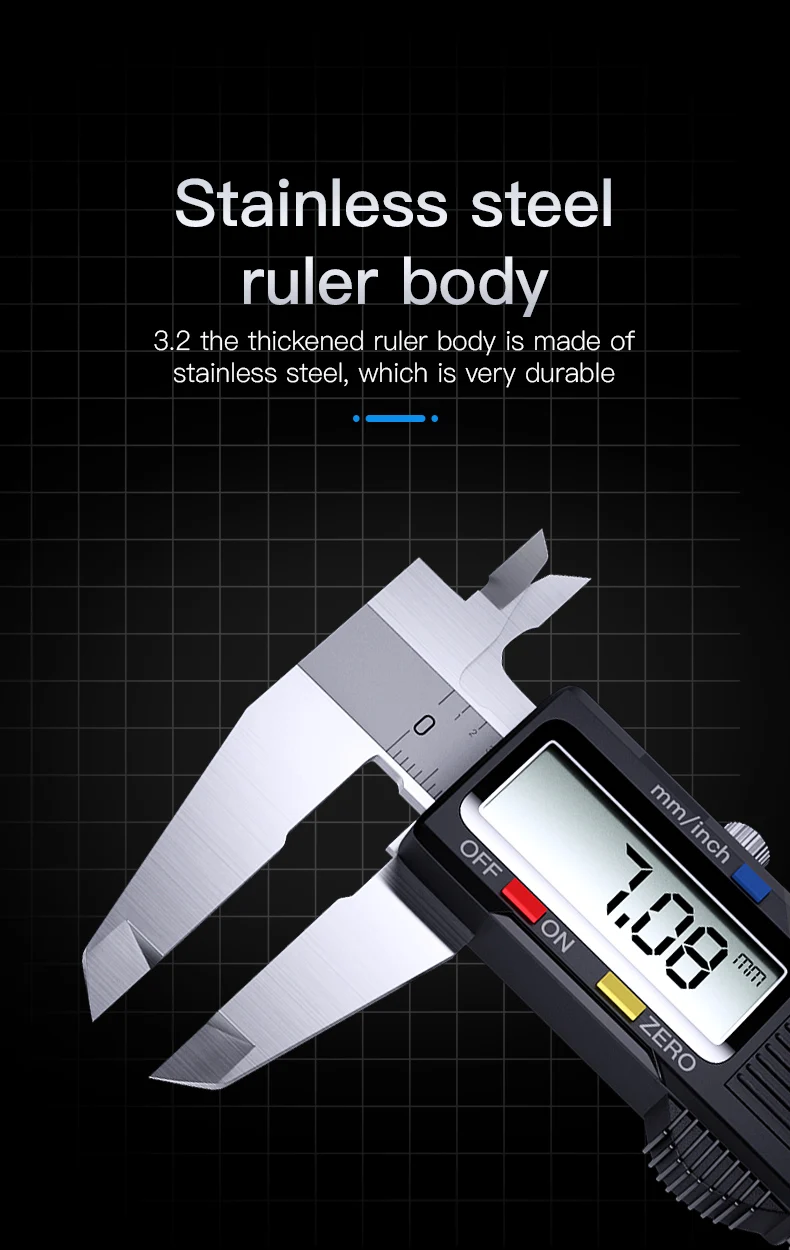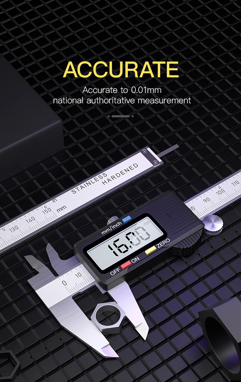 1. штангенциркуль с цифровым дисплеем, профессиональное измерение, точное и прочное, стабильное считывание. 2. Доступны четыре модели: 0-100 мм, 0-150 мм, 0-200 мм, 0-300 мм 3. Точность до 0,01 мм, авторитетные измерения и испытания, гарантия качества и точности 4. Два вида списка измерений: один ключевой переключатель метрических/британских измерений 5. Показания высокой четкости: ЖК-дисплей с большим экраном высокой четкости, четкие и точные показания 6. Увеличенная литиевая батарея, Низкое энергопотребление, длительное время автономной работы 7. Стопорная Гайка: данные измерения замка 8. Корпус из нержавеющей стали: антикоррозийный, антикоррозийный и устойчивый к падению 9. Технология происхождения: возврат к нулю в любой позиции