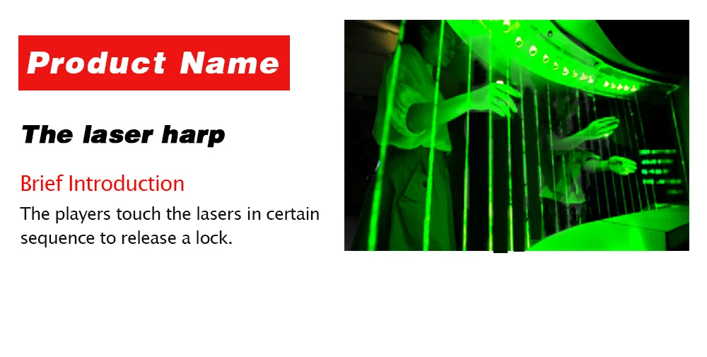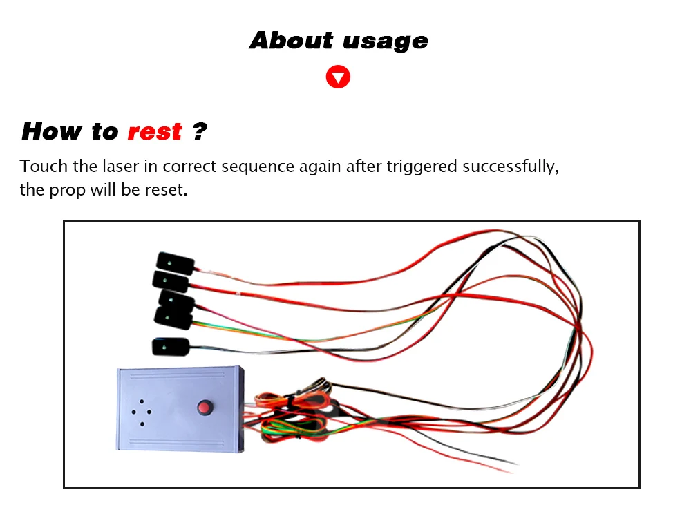 Искатели приключений могут найти этот реквизит в комнате. Если они прикоснутся к любому из этих лазеров, будет звук наконечника. Так что это как играть в арфу в комнате, а лазеры-как струны. В случае правильной последовательности блокировка будет разблокирована. В противном случае ничего не произойдет.