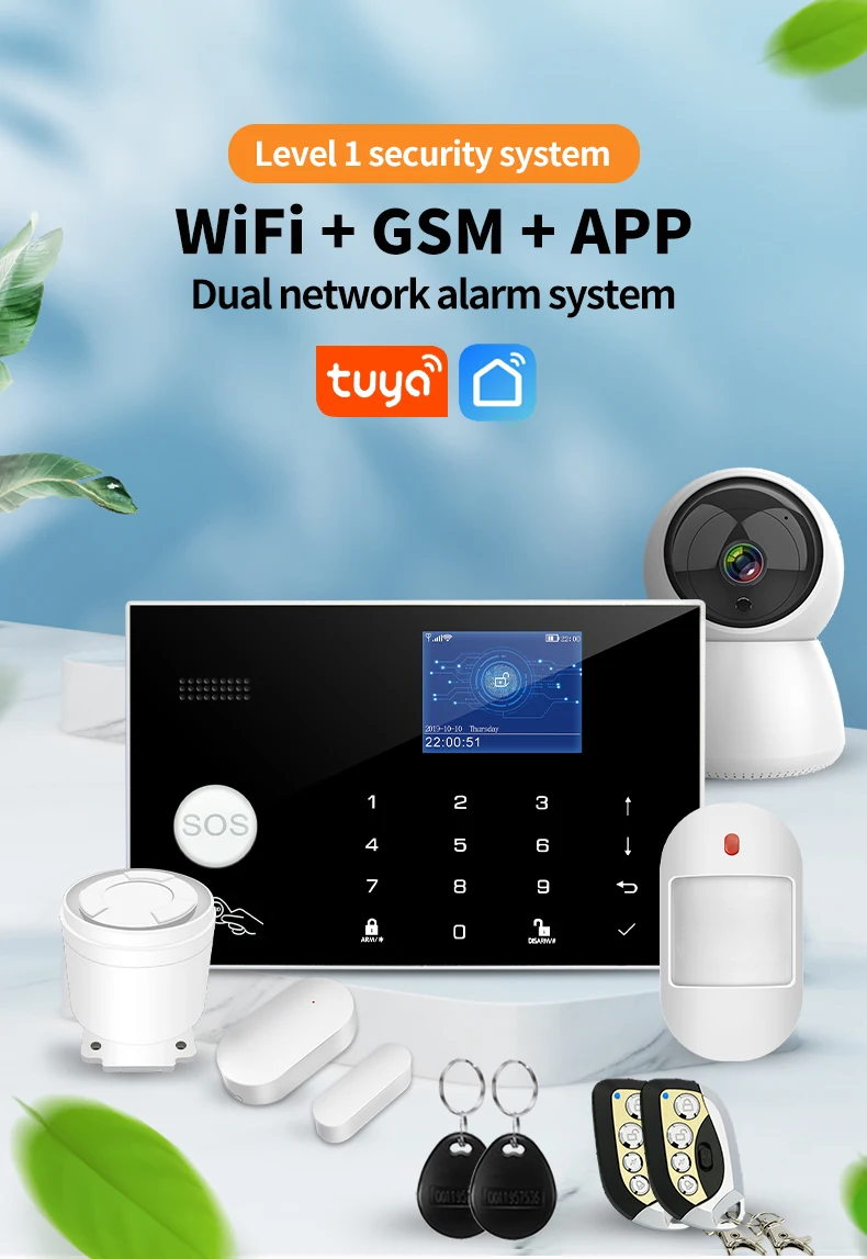 Вариант «N»: 1 Хост сигнализации (версия 4G) + 1 USB адаптер питания + 1 проводная сирена + 2 RFID карты + 2 пульта дистанционного управления + 1 датчик двери + 1 инфракрасный детектор + 1 камера Tuya.