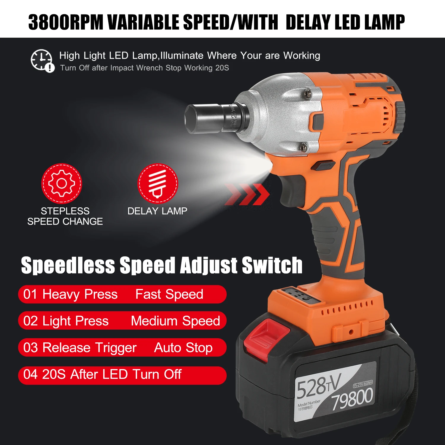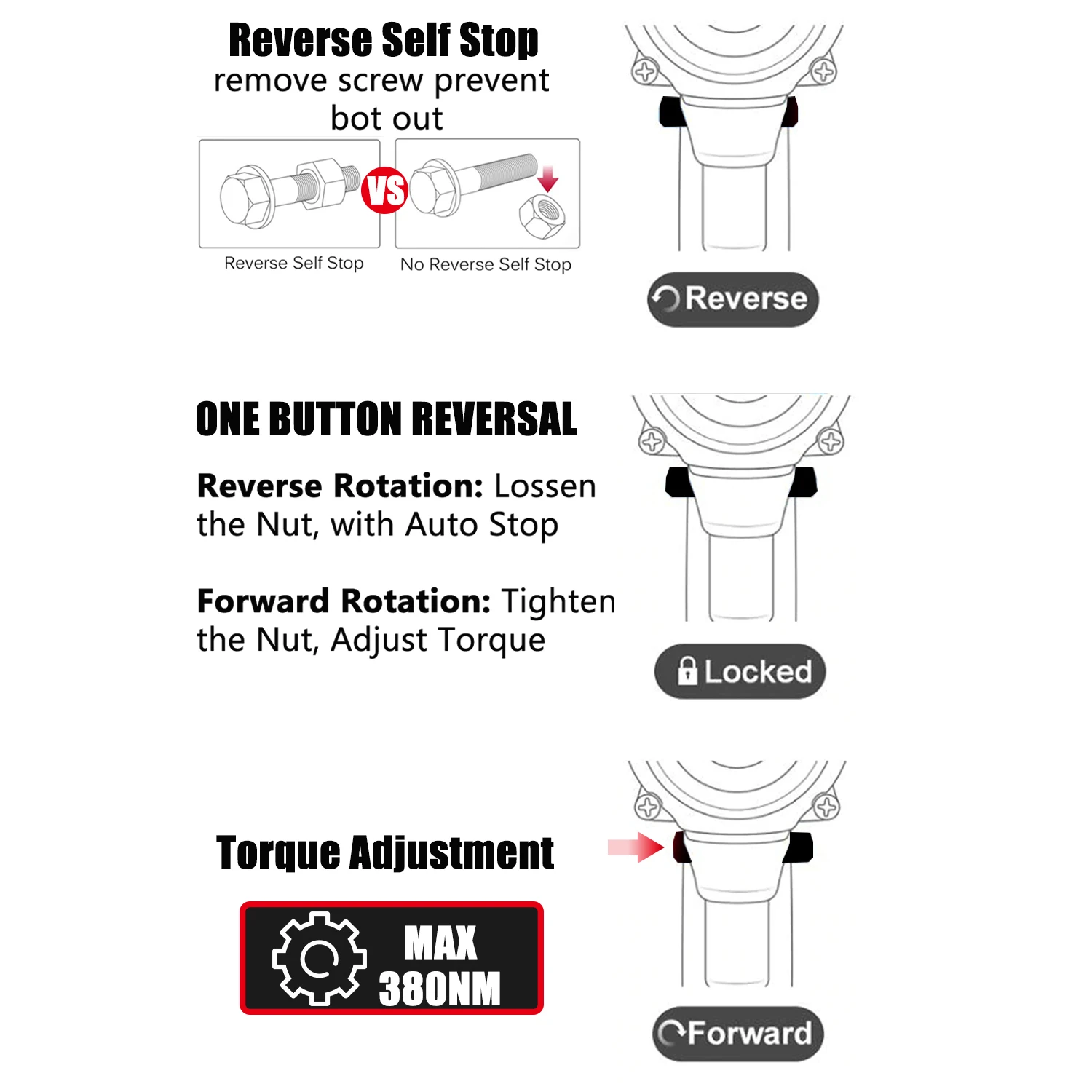 Удобная кнопка:Кнопка для блокировки пускового механизма, безопасна, предотвращает случайную работу; Также нажмите кнопку, чтобы изменить направление вращения (вперед/назад), отвечает различным требованиям, очень подходит для затягивания или ослабления гаек и болтов.