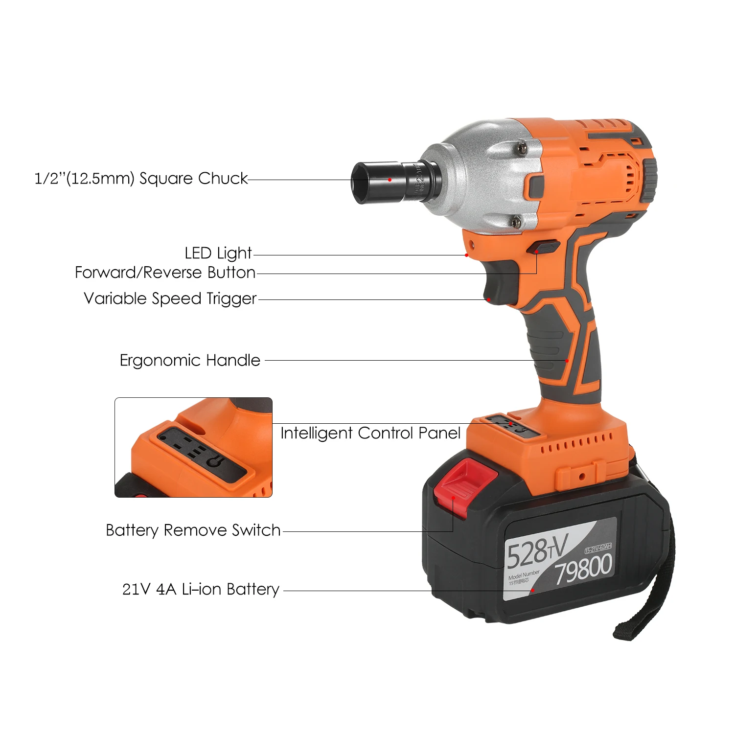 Аккумулятор большой емкости:Литий-ионный аккумулятор высокой емкости 21 В, С сверхбыстрой зарядкой, занимает всего несколько часов для полной зарядки и позволяет гаечному ключом непрерывно работать в течение длительного времени.