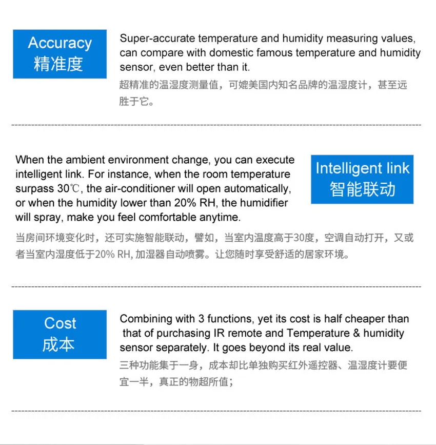 1. Массивная ИК-код данных: Поддержка более 4000 самых лучших брендов, более чем 50000 ИК-кодов в облаке, Поддержка ed устройств библиотеки постоянно обновляется с помощью облачных вычислений.