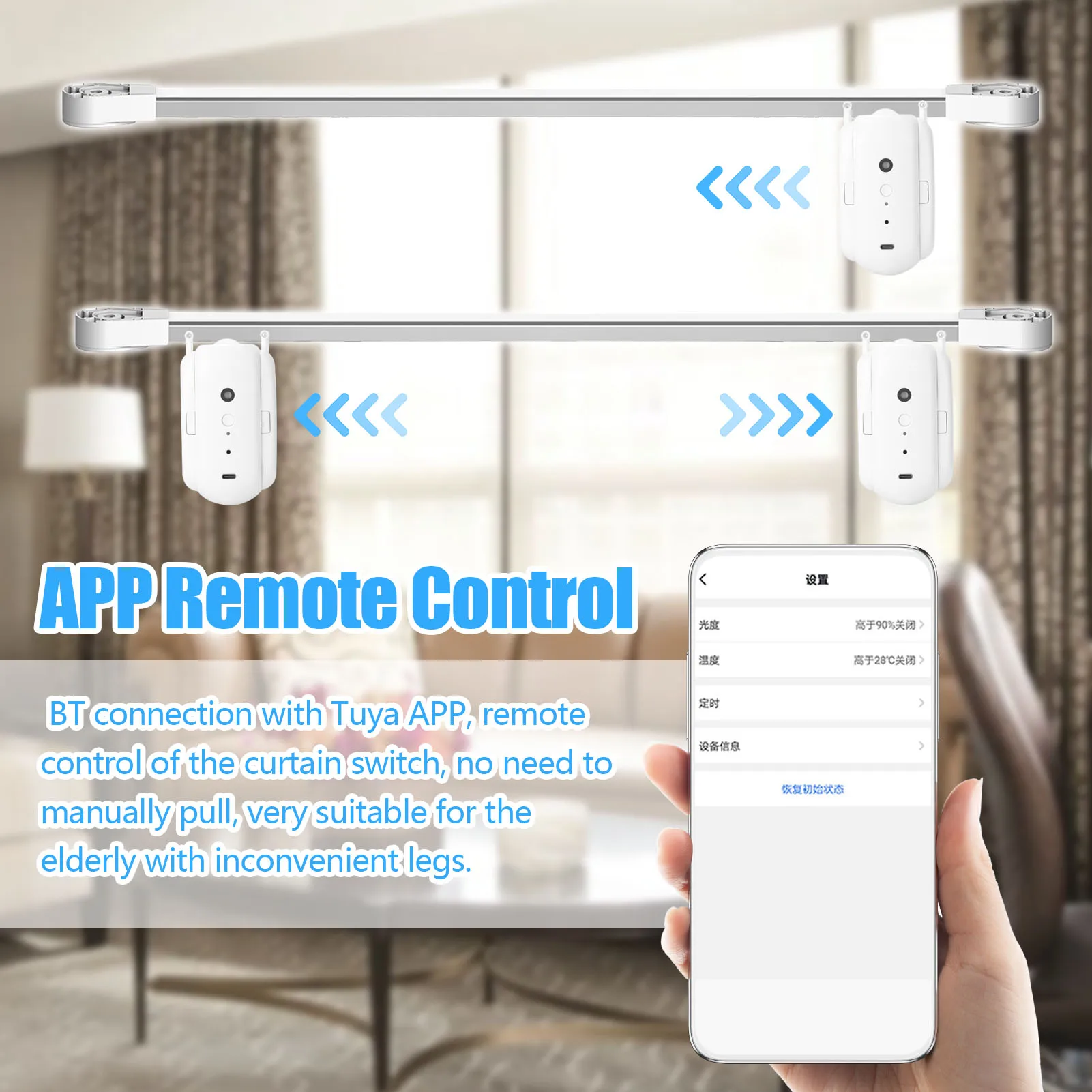 APP Remote Control: BT connection with Tuya APP, remote control of the curtain switch, no need to manually pull, very suitable for the elderly with inconvenient legs, making life more intelligent.