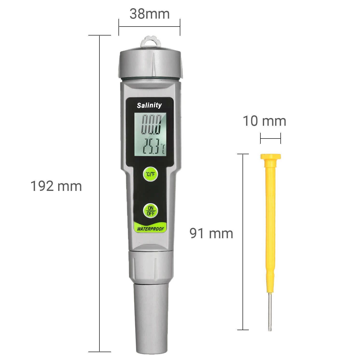 Надежное качество: Высокочувствительный водонепроницаемый зонд умный чип для быстрого и точного измерения, а также четкий ЖК-экран двойной дисплей солености и температуры.