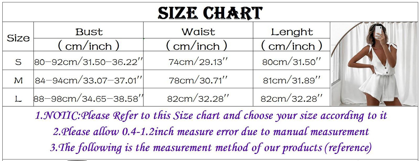 Size Bust Waist Length S 80-92cm/31.50-36.22'' 74cm/29.13'' 80cm/31.50'' M 84-94cm/33.07-37.01'' 78cm/30.71'' 81cm/31.89'' L 88-98cm/34.65-38.58'' 82cm/32.28'' 82cm/32.28''