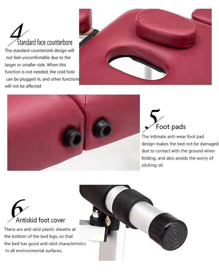 Информация о продукте 1. Трехслойная усиленная двойная ручка Кожаная двойная ручка, ремешок не прост в обращении, легко перемещать кровать при складывании, светильник практичный. 2. Металлический замок Металлический замок Seiko на традиционный кожаный чехол выбран, который может надежно зафиксировать кровать при складывании, до тех пор, пока переключатель мягко перемещается. 3. Утолщенный шарнир Высокое качество УТОЛЩЕННЫЙ шарнир, прочно соединяет оба конца кровати, гальванический процесс, долговечная яркость 4. Стандартная Торцевая поверхность Стандартная конструкция потайной раковины не будет чувствовать себя некомфортно из-за большой или меньшей стороны. Когда эта функция не нужна, отверстие холодной воды может быть подключено, и другие функции не будут зависеть 5. Подушечки для ног Интимная Противоизносная подкладка для ног не повреждает кровать из-за контакта с землей при складывании, а также позволяет избежать беспокойства о прилипании масла. 6. Противоскользящий чехол для ног Есть противоскользящие пластиковые оболочки в нижней части ножки кровати, так что кровать имеет хорошие противоскользящие характеристики на всех поверхностях окружающей среды. 7. Лицевая столешница Массажная кровать оснащена стандартными отверстиями для дыхания, которые подходят для лица, гладкое дыхание и легкий опыт. 8. Съемный подголовник Подушка для головы может регулировать угол в соответствии с потребностями для удовлетворения различных потребностей в уходе. Его также можно снять и разместить свободно. Полная человечность