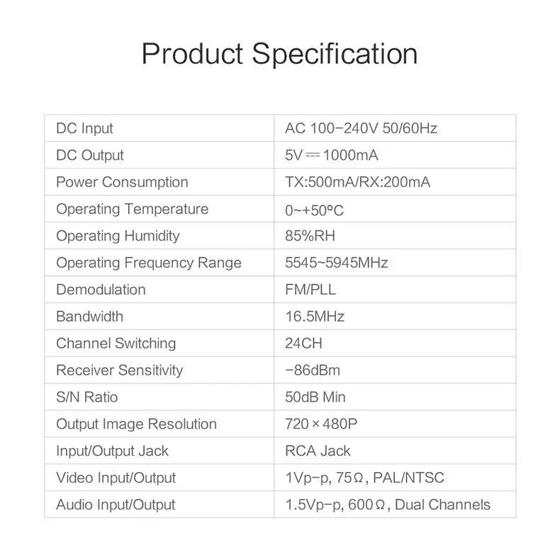 7. Полная аппаратная конструкция, никакого программного обеспечения, подключи и играй, компактный внешний вид, размер: 10 см x 8,5 см x 3,0 см 5,8 ГГц модуль прошел сертификацию FCC, аддитивного цветового пространства в Китае (стандарты CE, аттестация, беспроводное применение безопасно и надежно