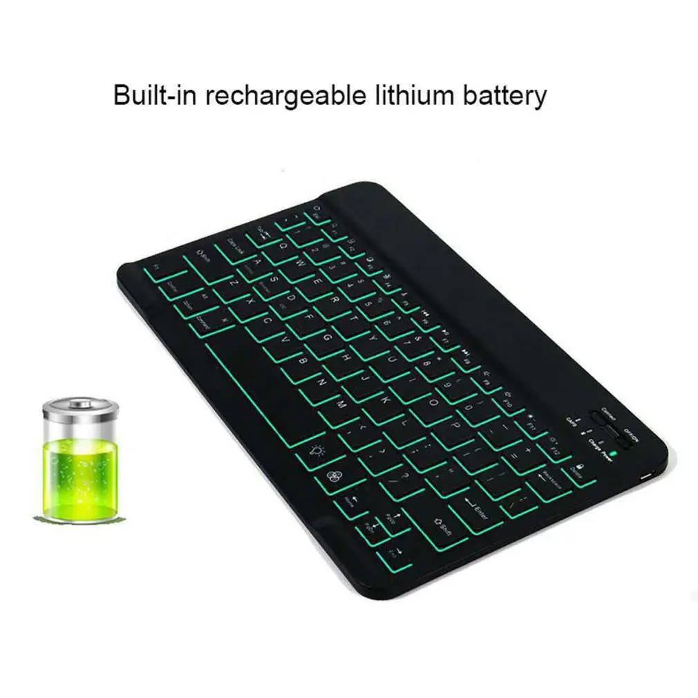Особенности: 1. Семь цветов светящаяся клавиатура: с зазором и характеристики светильник передачи, это семь цветов светящаяся клавиатура, удобный для использования в ночное время. 2. Перезаряжаемая беспроводная клавиатура: встроенный аккумулятор большой емкости, высокая эффективность и энергосбережение. 3. Дизайн: с светящимся дизайном, эта клавиатура классная и выглядит элегантно и изысканно. 4. Идеальный размер и ультратонкий: Эта компактная и ультратонкая клавиатура с более тонким профилем позволяет легко переносить и перемещать. 5. Удобный ввод текста и бесшумный щелчок: удобный ввод текста и бесшумный щелчок, даже если вы работаете ночью, это не повлияет на отдых вашей семьи, что делает вас сосредоточенными на вашей работе. Описание: Эта компактная и ультратонкая клавиатура с тонким профилем позволяет легко переносить и перемещать, а также с зазором и передачей света, это семицветная светящаяся клавиатура, это Ковенант для ночного использования. Характеристики: Тип: 7 дюймов, 10 дюймов (опционально) Размер: 7 дюймов: 200*125,9*6 мм 10 дюймов: 247,5*150*6,4 мм Категория: Беспроводная Клавиатура Емкость литиевой батареи: 400 мАч Время зарядки: 2-3 часа Время работы: 90 дней Посылка включает в себя: 1 * Клавиатура /1 * Клавиатура с 2,4G беспроводной двойной модельной мышью (опционально)