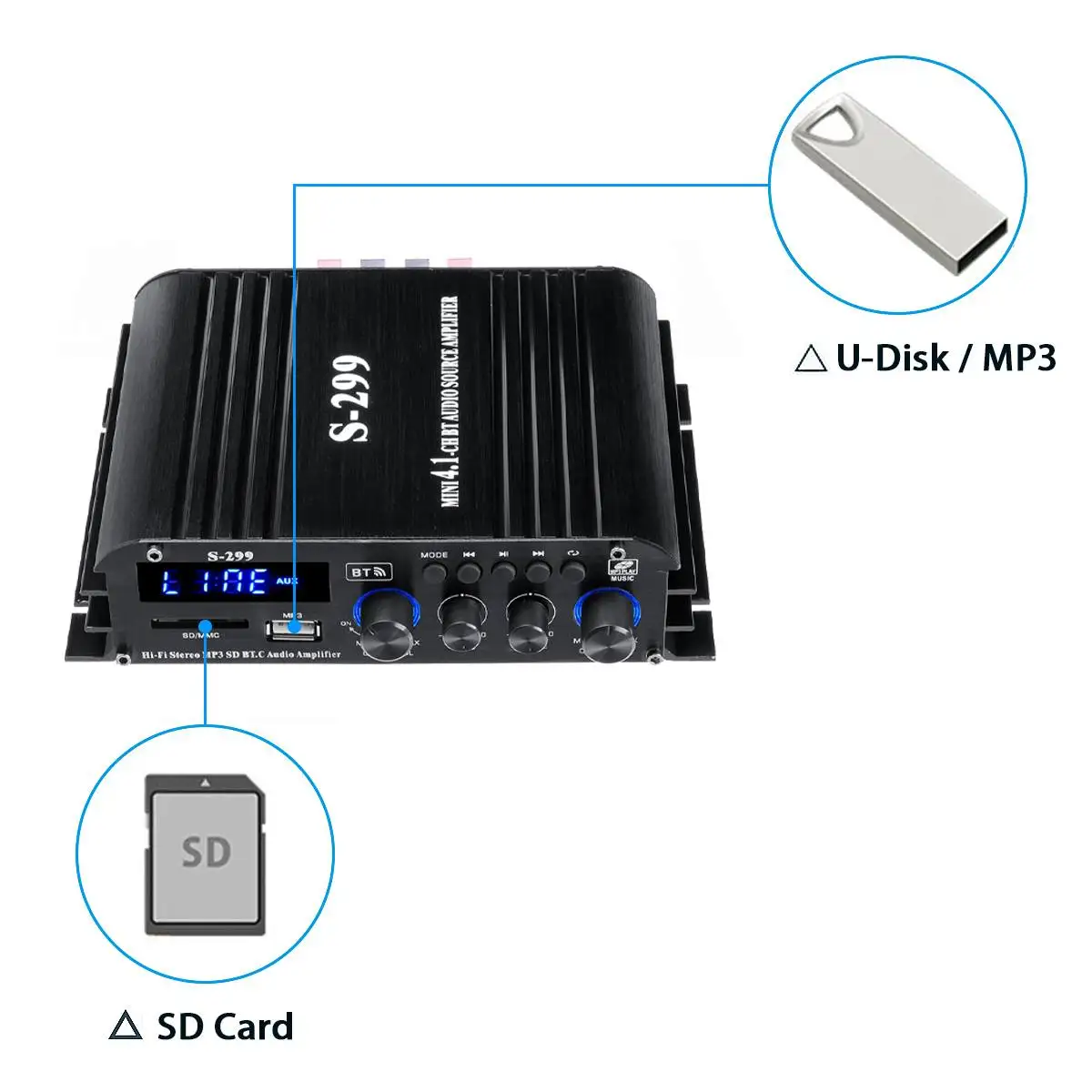 -Sd-карта, u-диск, AUX, MP3 формат воспроизведения, Поддержка беспроводного подключения bluetooth.