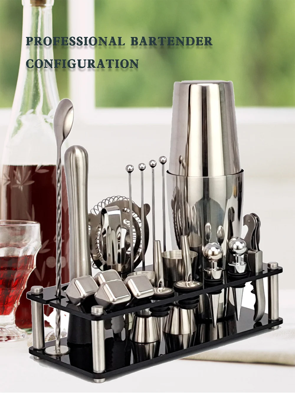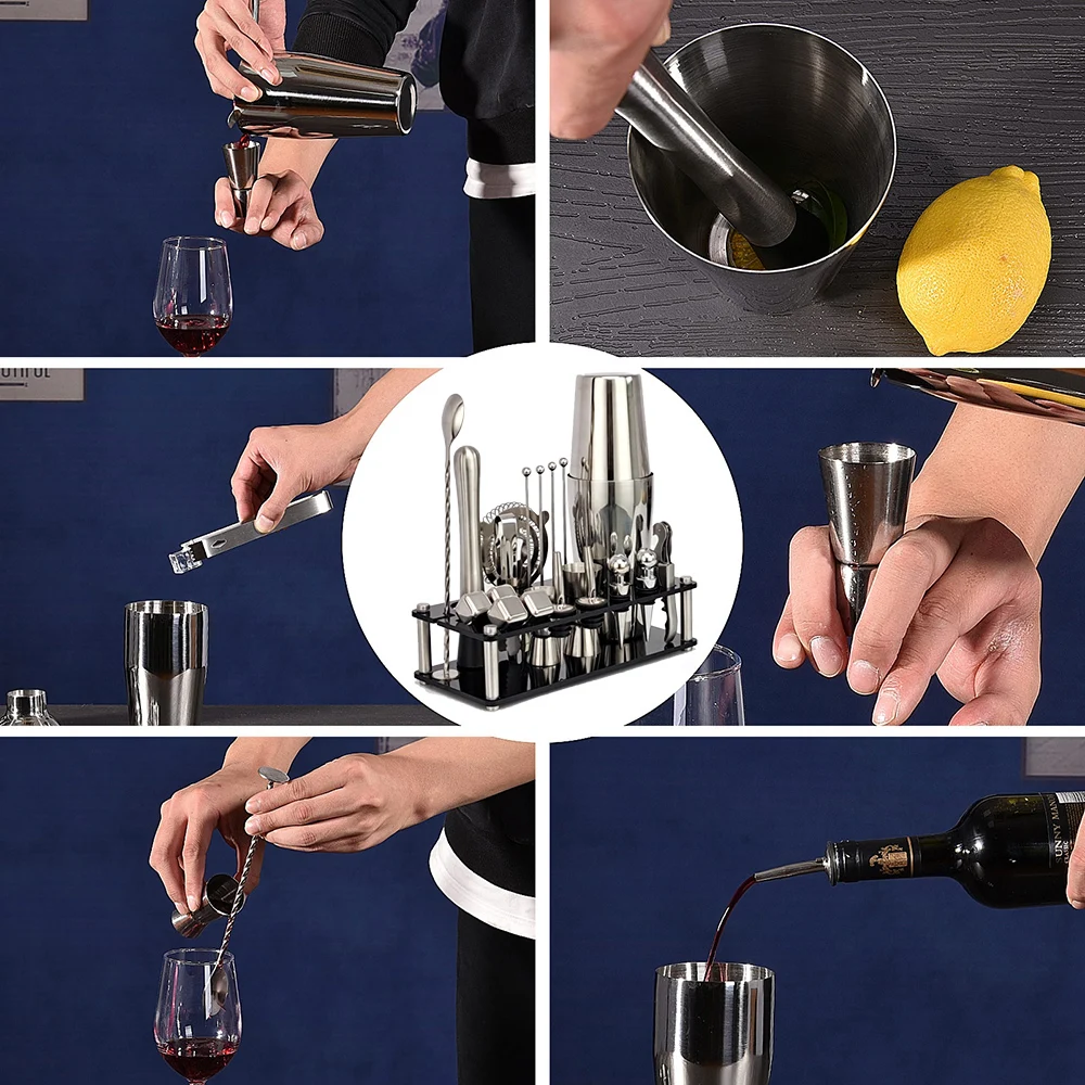 Набор для коктейльного бара изготовлен из высококачественной нержавеющей стали, устойчив к холоду и высокой температуре, не содержит бисфенола, не беспокойтесь о вреде для вашего организма или влиянии на вкус вашего напитка. Шейкер имеет эргономичный дизайн, что позволяет легко захватывать и делать вкусные коктейли без нагрузки. Все аксессуары для бара помещаются в стильные акриловые кронштейны, чтобы предотвратить царапание аксессуаров и сохранить дом чистым и аккуратным.