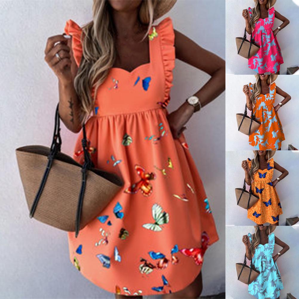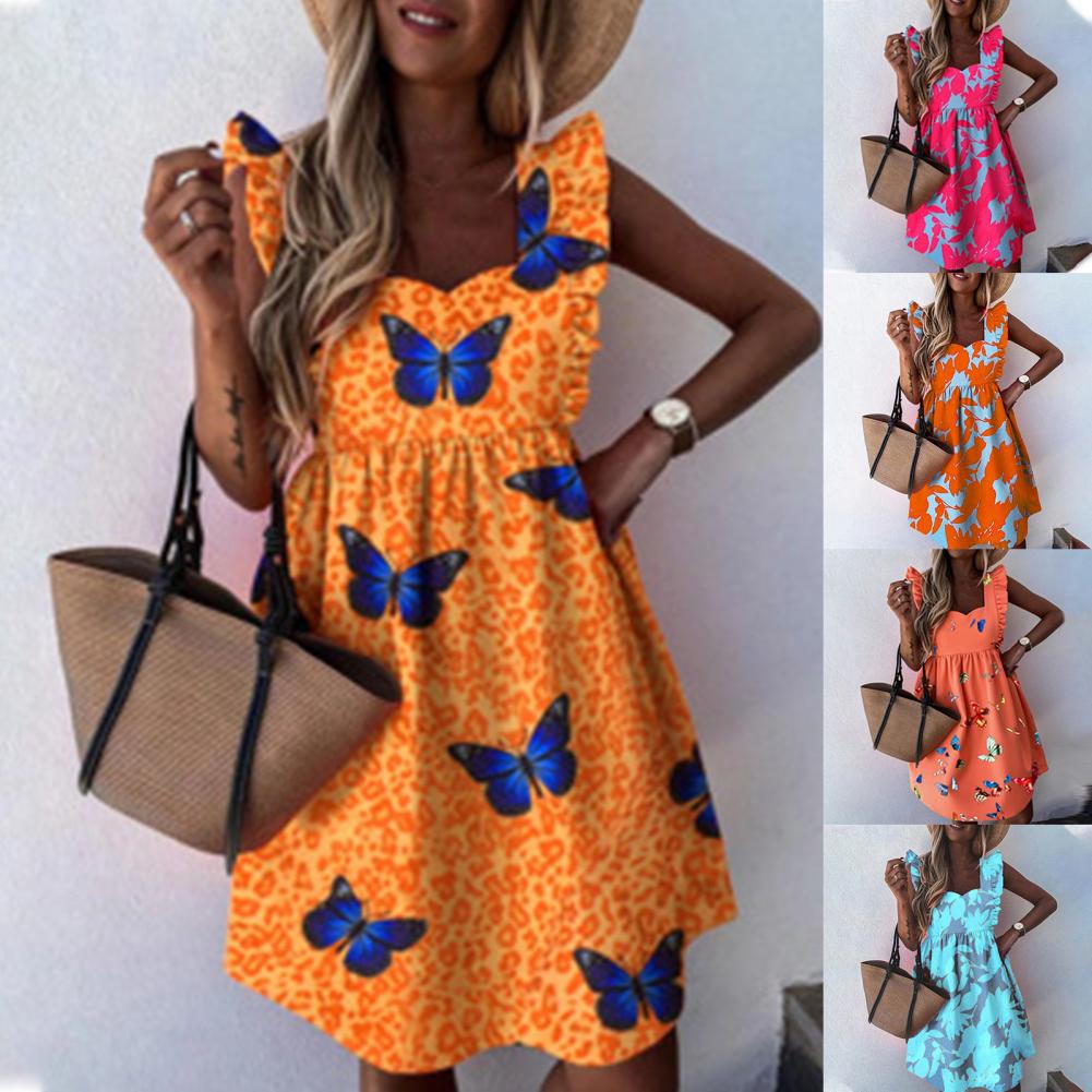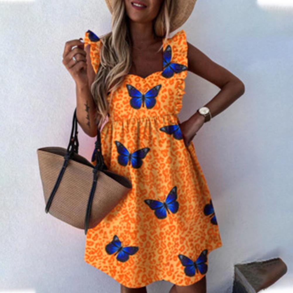 Женское платье с леопардовым принтом и бабочками, летние платья без рукавов, с квадратным вырезом и большим подолом, вечерние платья vestido de mujer