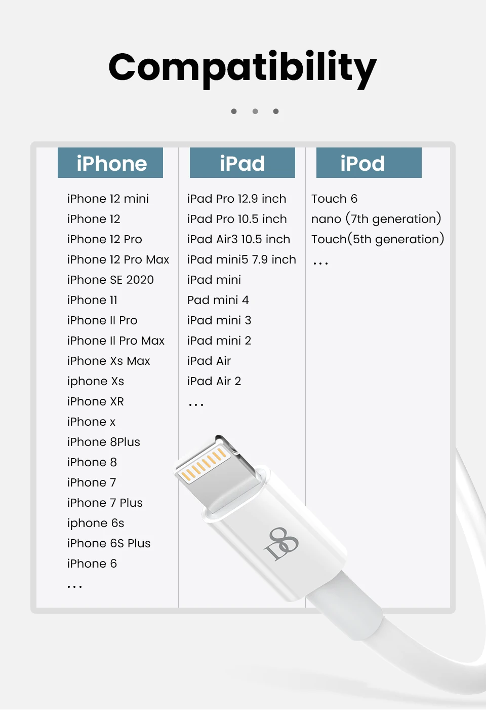 3. Универсальная совместимость:Совместимость с iPhone SE (2-го поколения) 12 / 11 / XS Max / XR / X / 8 Plus/8/7 Plus / 7 / 6s Plus / 6s / 6 Plus / 6 Plus /5s / 5c / 5 / iPad Pro / iPad Air / Air 2 / iPad mini / mini 2 / mini 4 / iPad 4th gen / iPod Touch 5th gen / iPod nano 7th gen и Beats Таблетки +