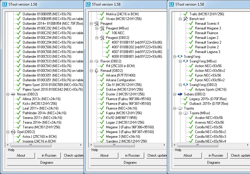 Carlist STool / MTool 1.58Subaru (OBD2)Legacy 2015+ (D70F35xx) Read/Write mileage, Read/Write EEPROMOutback 2015+ (D70F35xx) Read/Write mileage, Read/Write EEPROMOpel (GM OBD2)Astra J (25C160 in BCM) Read/Write mileage, Read PIN code (CarPass)Insignia (24C16 in BCM) Read/Write mileage, Read PIN code (CarPass)Mokka (24C16 in BCM) Read/Write mileage, Read PIN code (CarPass)New !Cadillac (GM OBD2)New !Escalade 2019 (25C320 in BCM)Read/Write mileageChevrolet (GM OBD2)Aveo (25C160 in BCM) Read/Write mileage, Read PIN code (CarPass)Camaro (24C16 in BCM) Read/Write mileage, Read PIN code (CarPass)Cobalt (25C160 in BCM) Read/Write mileage, Read PIN code (CarPass)Cruze (24C16 in BCM) Read/Write mileage, Read PIN code (CarPass)Malibu (24C16 in BCM) Read/Write mileage, Read PIN code (CarPass)Orlando (24C16 in BCM) Read/Write mileage, Read PIN code (CarPass)New !Silverado 2017 (25C320 in BCM) Read/Write mileageNew !Suburban 2019 (25C320 in BCM) Read/Write mileageTrailblazer (24C16 in BCM) Read/Write mileage, Read PIN code (CarPass)New !GMC (GM OBD2)New !Sierra 2017 (25C320 in BCM) Read/Write mileageNew !Yukon 2019 (25C320 in BCM) Read/Write mileageRavon (GM OBD2)R4 (25C320 in BCM) Read/Write mileage, Read PIN code (CarPass)KIA (OBD2)*KIA Stinger 2018+ (NEC w/o external EEPROM) Read/Write mileage, Read/Write EEPROMSportage 2014+ (NEC w/o external EEPROM) Read/Write mileage, Read/Write EEPROMOptima (K5) 2014+ (NEC w/o external EEPROM) Read/Write mileage, Read/Write EEPROMSorento 2015+ (NEC w/o external EEPROM) Read/Write mileage, Read/Write EEPROMSoul 2014+ (NEC w/o external EEPROM) Read/Write mileage, Read/Write EEPROMMohave 2017+ (NEC w/o external EEPROM) Read/Write mileage, Read/Write EEPROMRio 2017+ (NEC w/o external EEPROM) Read/Write mileage, Read/Write EEPROMSorento (NEC w/o external EEPROM) Read/Write mileage, Read/Write EEPROMSportage 2016+ (NEC w/o external EEPROM) Read/Write mileage,Read/Write EEPROMCeed 2015+ (24C16) Read/Write mileage, Read/Write EEPROMCeed 2015+ (NEC w/o external EEPROM) Read/Write mileage,Read/Write EEPROMCeed 2009+, 2012+ (24C16) Read/Write mileage, Read/Write EEPROMK5 2020+ (R7F7014хх) Read/Write mileage, Read/Write EEPROMK5 2020+ Full LCD (R7F7014хх) Read/Write mileage, Read/Write EEPROMMagentis 2009+ (24C16) Read/Write mileage, Read/Write EEPROMOptima 2011+ (24C16) Read/Write mileage, Read/Write EEPROMSorento 2009+ (24C16) Read/Write mileage, Read/Write EEPROMSorento 2012+ (24C16) Read/Write mileage, Read/Write EEPROMSoul 2010+ (24C16) Read/Write mileage, Read/Write EEPROMSoul 2014+ (24C16) Read/Write mileage, Read/Write EEPROMSportage 2010+ (24C16) Read/Write mileage, Read/Write EEPROMSportage 2015+ (24C16) Read/Write mileage, Read/Write EEPROMSportage 2016+ Yazaki (NEC+25160) OBD2+Calculator Read/Write mileageSportage 2017+ Yazaki (NEC+25160) Read/Write mileageSportage 2019+ Yazaki (NEC+25160) Read/Write mileageSportage 2020+ Yazaki (R7F70140) Read/Write mileage, Read/Write EEPROM* In some cars of 2018+ model year, the CAN bus from the Dashboard does not go to the OBD2 connector,such Dashboards must be removed from the car and connected on the table.KIA Denso 2013+ (OBD2 with Flashing)Cadenza 2013+ (mb91F037+93C66)Read/Write mileage, Read/Write EEPROM, Read/Write Full FlashCarens 4 (mb91F037+93C66)Read/Write mileage, Read/Write EEPROM, Read/Write Full FlashCarnival 2015+ (mb91F061)Read/Write mileage, Read/Write EEPROM, Read/Write Full FlashCerato(Forte) 2013+ (mb91F037+93C66)Read/Write mileage, Read/Write EEPROM, Read/Write Full FlashCerato(Forte) 2013+ Supervision (mb91F037+93C66)Read/Write mileage, R/Write EEPROM, R/W Full FlashCerato(Forte) 2015+ (mb91F061)Read/Write mileage, Read/Write EEPROM, Read/Write Full FlashCerato 2015+ (mb91F067)Read/Write mileage, Read/Write EEPROM, Read/Write Full FlashCerato 2018+ (mb91F061)Read/Write mileage, Read/Write EEPROM, Read/Write Full FlashCeed 2018+ (mb91F061)Read/Write mileage, Read/Write EEPROM, Read/Write Full FlashNew !K7 (Cadenza) 2016+ (mb91F067)Read/Write mileage, Read/Write EEPROM, Read/Write Full FlashNiro 2018+ (mb91F061)Read/Write mileage, Read/Write EEPROM, Read/Write Full FlashPicanto 2015+ (mb91F061)Read/Write mileage, Read/Write EEPROM, Read/Write Full FlashPicanto 2017+ (mb91F062)Read/Write mileage, Read/Write EEPROM, Read/Write Full FlashSorento 2015+ (mb91F061)Read/Write mileage, Read/Write EEPROM, Read/Write Full FlashSorento 2015+ (mb91F067)Read/Write mileage, Read/Write EEPROM, Read/Write Full FlashSoul 2019+ (mb91F061)Read/Write mileage, Read/Write EEPROM, Read/Write Full FlashSedona 2015+ (mb91F047+93C66)Read/Write mileage, Read/Write EEPROM, Read/Write Full FlashQuoris 2013+ (mb91F037+93C66)Read/Write mileage, Read/Write EEPROM, Read/Write Full FlashSsangYong (OBD2)Actyon Sports (24C16) Read/Write mileage, Read/Write EEPROMVAZ (MBus) –Read/Write mileage, Read/Write EEPROM, Read FULL, PIN code finder.Kalina VDO NEC+93s56Priora VDO NEC+93s56Priora VDO NEC+93s56 w CANVAZ 2110,14,15,Niva VDO NEC+93c46 3pinVAZ 2110,14,15,Niva VDO NEC+93s56VAZ (OBD2)XRAY (MC9S12XHY256) Read/Write mileage, Read EEPROM, Read/Write FLASHKIA (MBus) -Read/Write mileage, Read/Write EEPROM, Read FULL, PIN code finder.Bongo VDO NEC+93s56Ceed VDO NEC+93C56Magentis VDO NECMagentis VDO NEC+93C56Optima VDO NECRio VDO NEC+93s56SOUL VDO NEC+93C56Sportage VDO NEC+93c56Venga VDO NEC+93s56Mohave NEC+93s56Hyundai (MBus) -Read/Write mileage, Read/Write EEPROM, Read FULL, PIN code finder.Accent VDO NECAccent VDO NEC+93C56Elantra VDO NECElantra VDO NEC+93c56H1 VDO NEC+93c56H100 VDO NEC+93C56HR VDO NEC+93C56I20 VDO NEC+93C56IX55 VDO NEC+93c56 Porter VDO NEC+93c56Porter VDO NECSonata VDO NECSonata VDO NEC+93c56Sonata VDO NF NEC+93c56Starex VDO NEC+93C56Starex GRX VDO NEC+93C56Terracan VDO NECTerracan VDO NEC v2Trajet VDO NEC+93c56Verna VDO NEC+93s56XG350 VDO NEC+93C56Genesis BH 2009 (NEC+24C16)KIA (OBD2 with Flashing)Rio 2011-2017 Supervision (mb90F025+93C66) Read/Write mileage, Read/Write EEPROM, Read/Write FlashHyundai (OBD2 with Flash