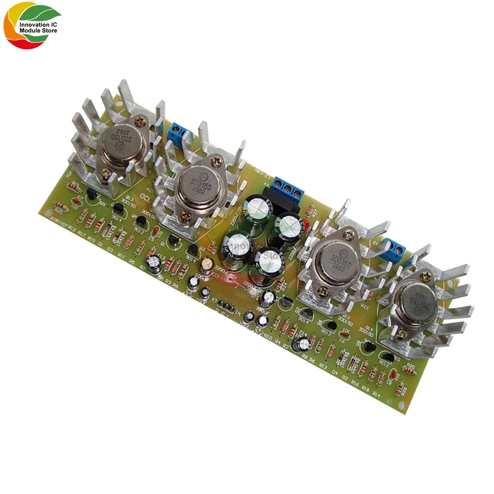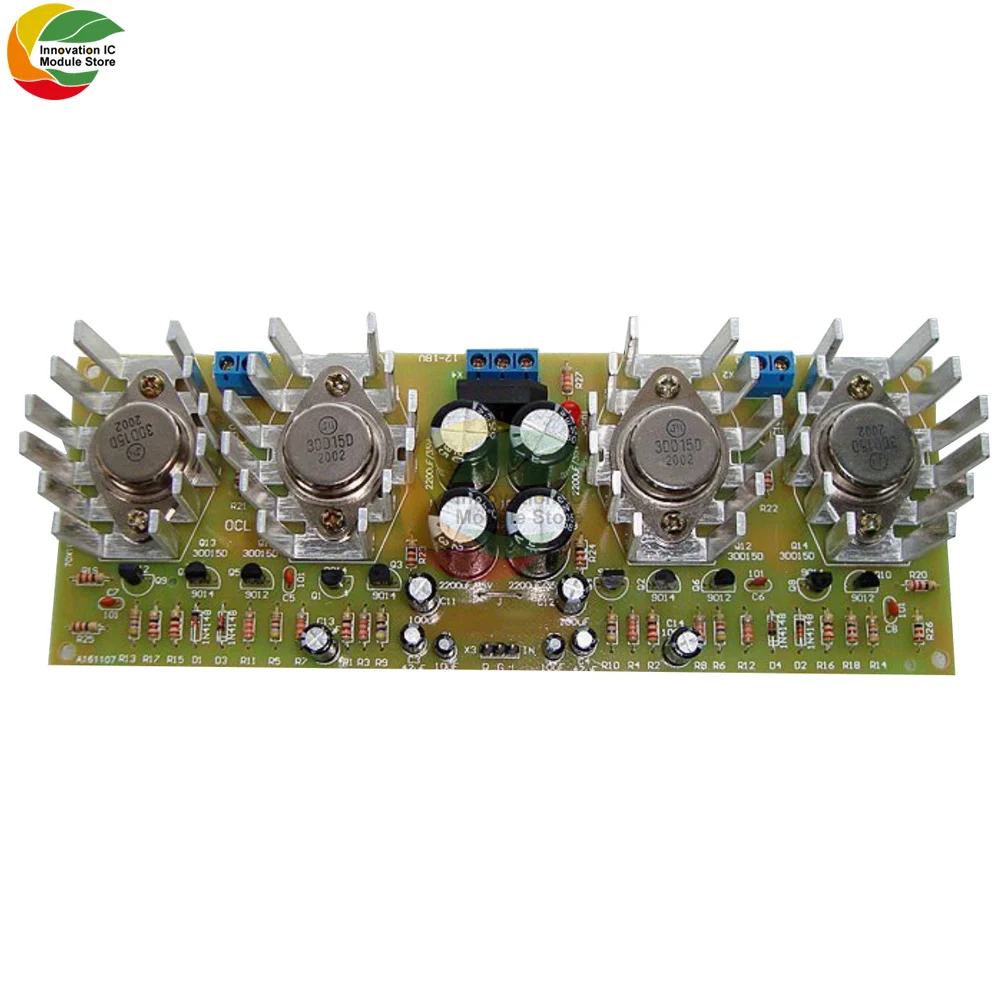 Схема печатной схемы этой цепи показана на рис. 3. Она включает в себя двухстороннюю схему усилителя мощности OCL и цепь источника питания постоянного тока. Между корпусом 4 высокомощных труб 2N3055 и печатной платой требуется теплоотвод, который крепится винтами. Резисторы устанавливаются горизонтально. Конденсаторы и триоды устанавливаются вертикально и близко к монтажной плате. Требования к пайке прочные и надежные. На печатной плате есть два перемычки, которые можно припаять железными проводами.