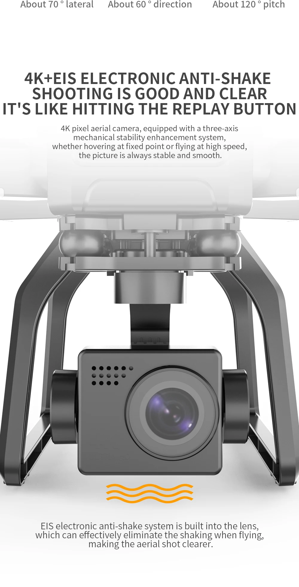 1: 3-осевой поворотник объектив оснащена широкоугольным 4K высокой четкости Wi-Fi, которая может регулироваться от заявленного из-за угла съемки фронтальной камеры на дистанционный пульт. 3-х осевой поворотник делает летательные аппараты съемки видео четче и более стабильным, и угол наклона делает поле зрения шире