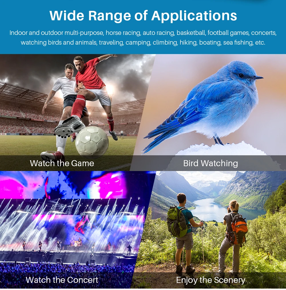 【Универсальная Совместимость 】 без искажений и уникальный дизайн крепления совместим с большинством смартфонов и мобильных устройств. Используется для гонок, пляжа, наблюдения за птицами, катания на лодках/яхтинга, скачек, охоты, активного отдыха, спорта, театра, путешествий.