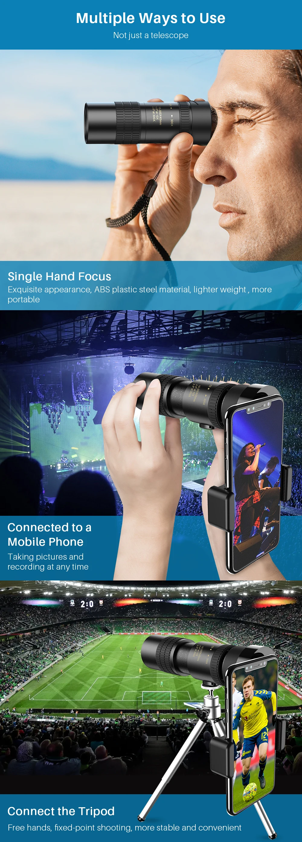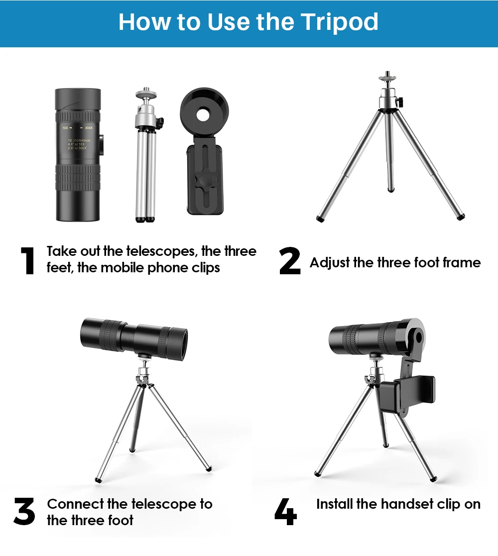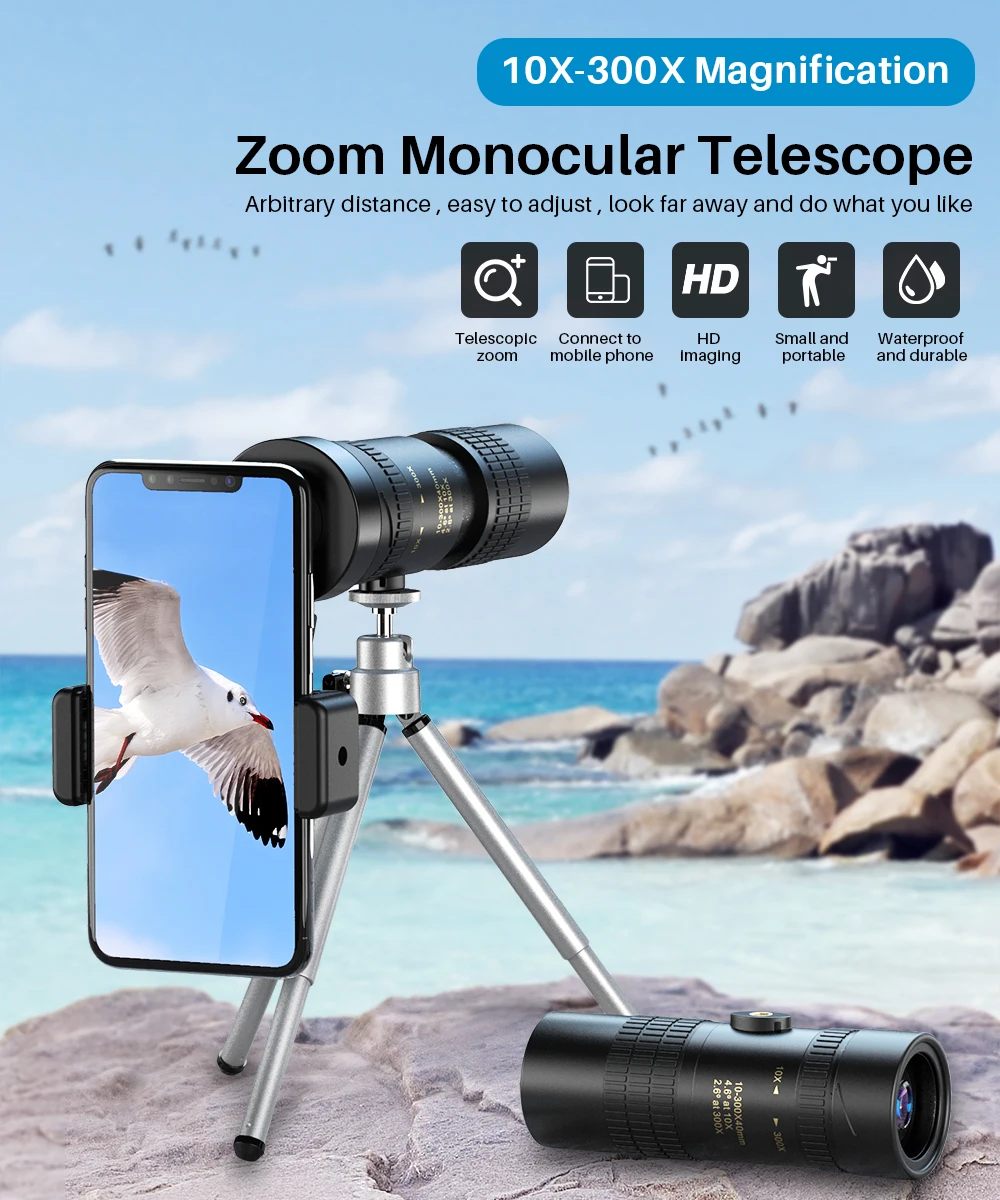 [Монокулярный объектив Super telephoto]: Антивибрационная система телескопа и специальный Трипод 3D гироскоп делают поле зрения телескопа очень стабильным при многократном усилении.