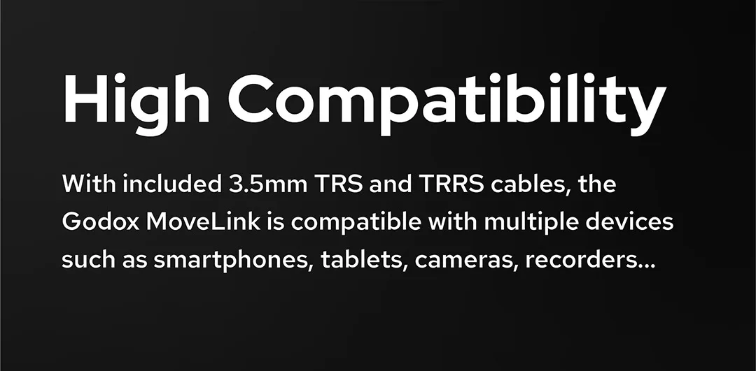 При включенном 3,5 мм ТРС и TRRS кабели, Godox MoveLink совместим с множеством устройств, таких как смартфоны, планшеты, камеры, recordersetc.