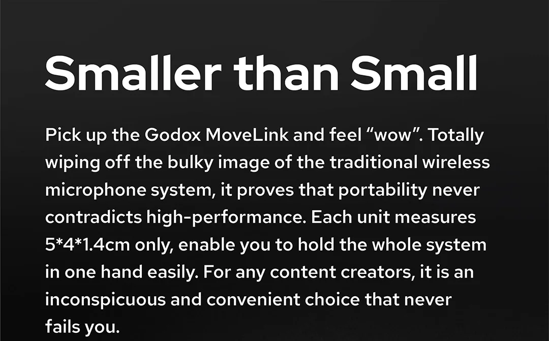 Возьмите theGodox movelink, который очень легкий и просто помещается в карман. Каждая единица measuresin5 * 4*1,4 cmonlyto позволяют вас, потому что вы сможете держать всю систему в одной руке легко. Для любых создателей контента, это незаметный и удобный выбор, который никогда не подводит вас.
