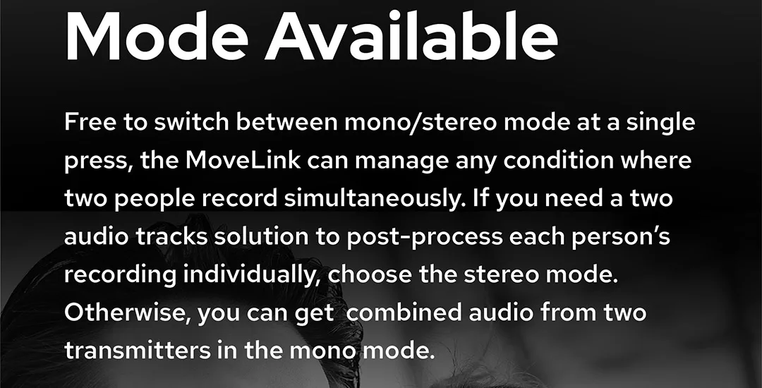 Свободно переключается между моно/стерео режимом, MoveLink может управлять любым состоянием, в котором два человека записывают одновременно. Если вам нужно решение с двумя звуковыми дорожками, чтобы обрабатывать запись каждого человека индивидуально, выберите режим стерео. В противном случае вы можете получить комбинированный звук от двух передатчиков в моно-режиме.