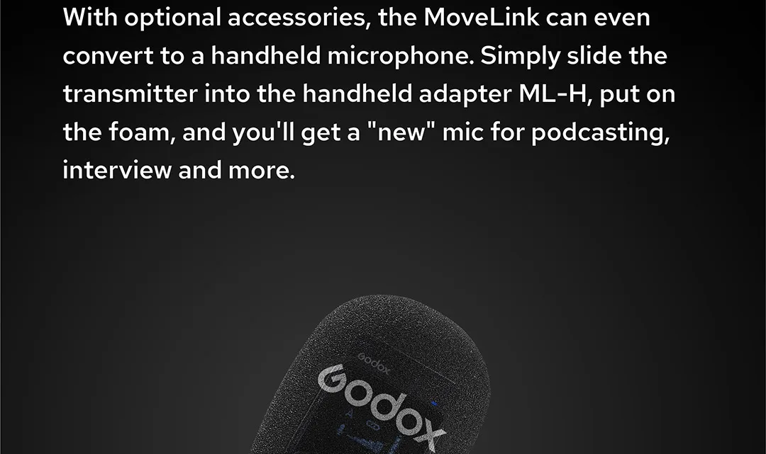 С дополнительными аксессуарами, MoveLink может evenbeconvertedto ручной микрофон. Просто вставьте передатчик в ручной адаптер ML-H с ветрозащитной пеной, и вы получите «Новый» микрофон для подкачки, интервью и многого другого.