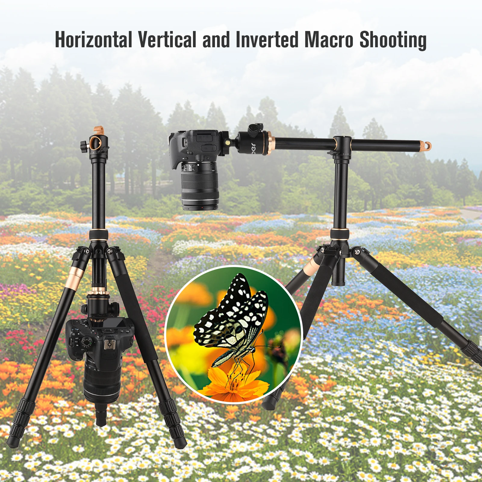 Многофункциональный штатив:Одна из ножек штатива может быть легко снята и работает как монопод или альпеншток для пеших прогулок, чтобы сделать вашу фотографию более разнообразной; А Функция горизонтального положения может помочь вам достичь более гибких углов съемки.