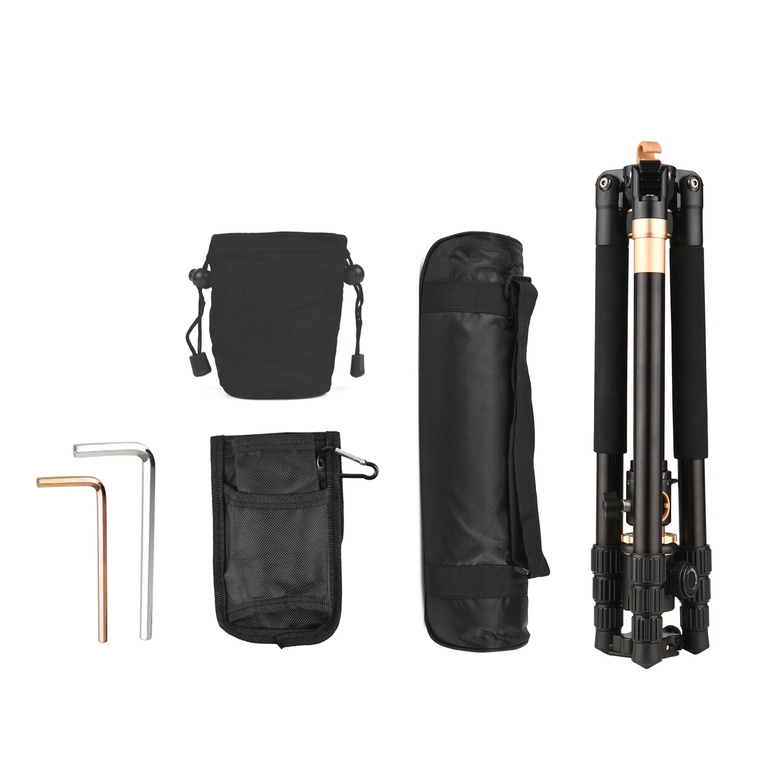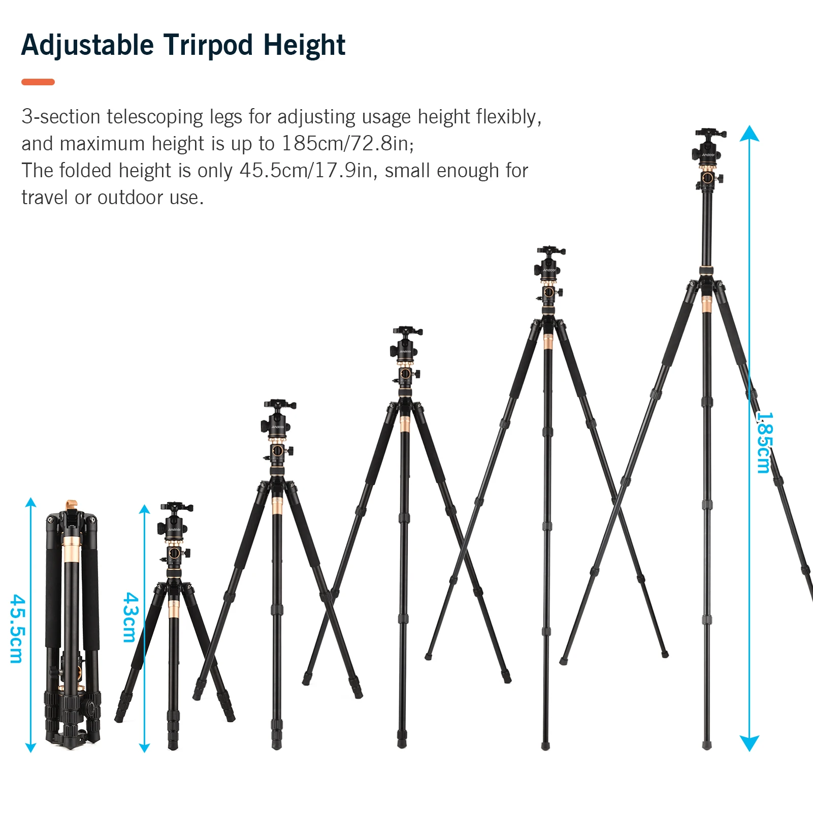 Портативный штатив для фотосъемки:Материал из алюминиевого сплава, вес нетто 1,67 кг/3,7 фунтов, легкий, но прочный; После отгибания, высота в сложенном виде составляет всего 45,5 см/17,9 дюйма, достаточно маленький для путешествий или использования на открытом воздухе. И поставляется с сумкой для хранения для удобной переноски.