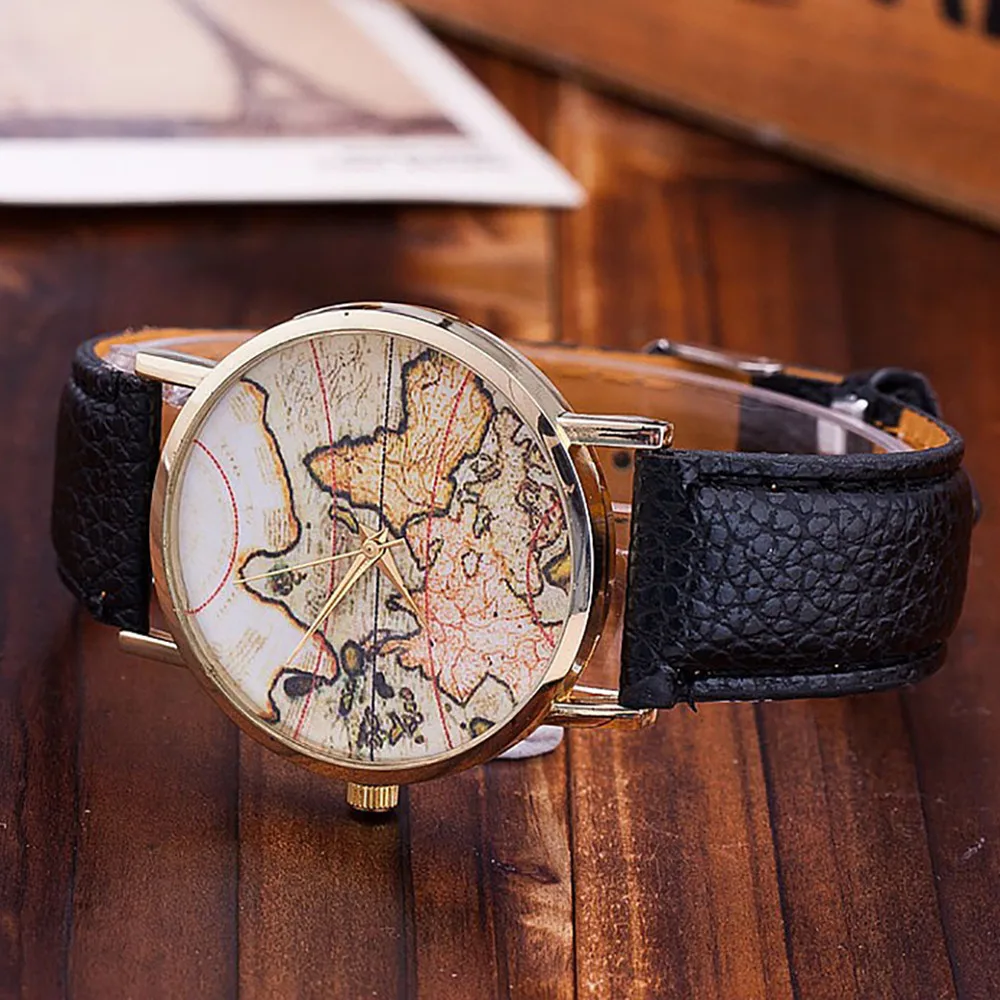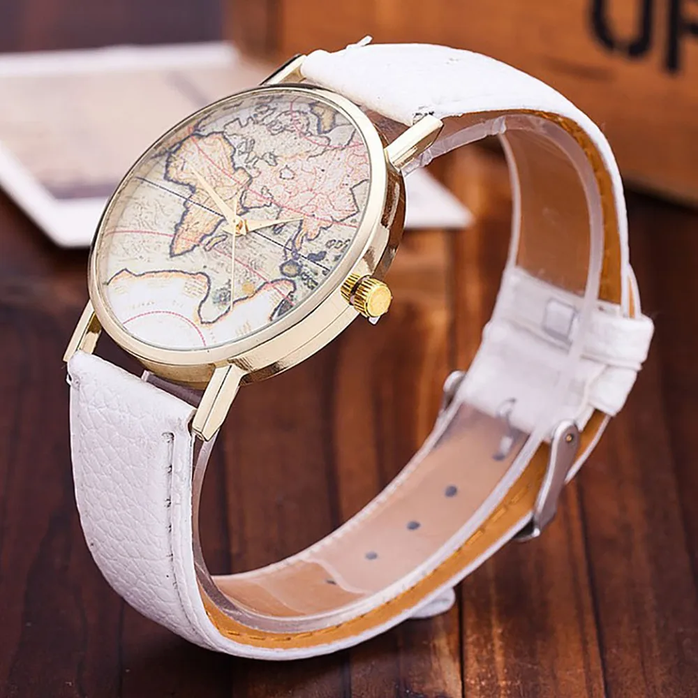 Модные женские Аналоговые кварцевые наручные часы с кожаным ремешком и картой мира