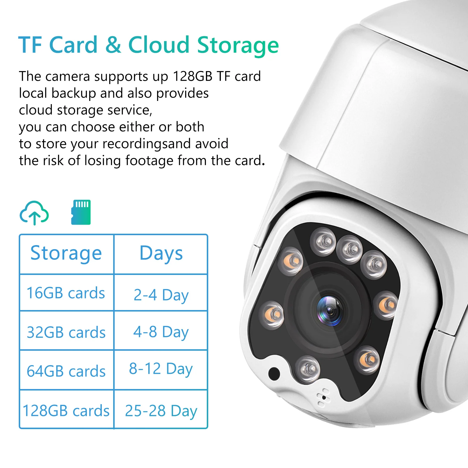 Зашифрованное локальное и Облачное хранилище:Встроенный слот для sd-карты поддерживает Micro SD-карту до 128 ГБ. (В комплект не входит sd-карта). Камеры безопасности также поддерживают зашифрованное безопасное Облачное хранилище, защищают записи от любых потерь кадра, которые могут возникнуть в результате повреждения, например, кражи камеры.