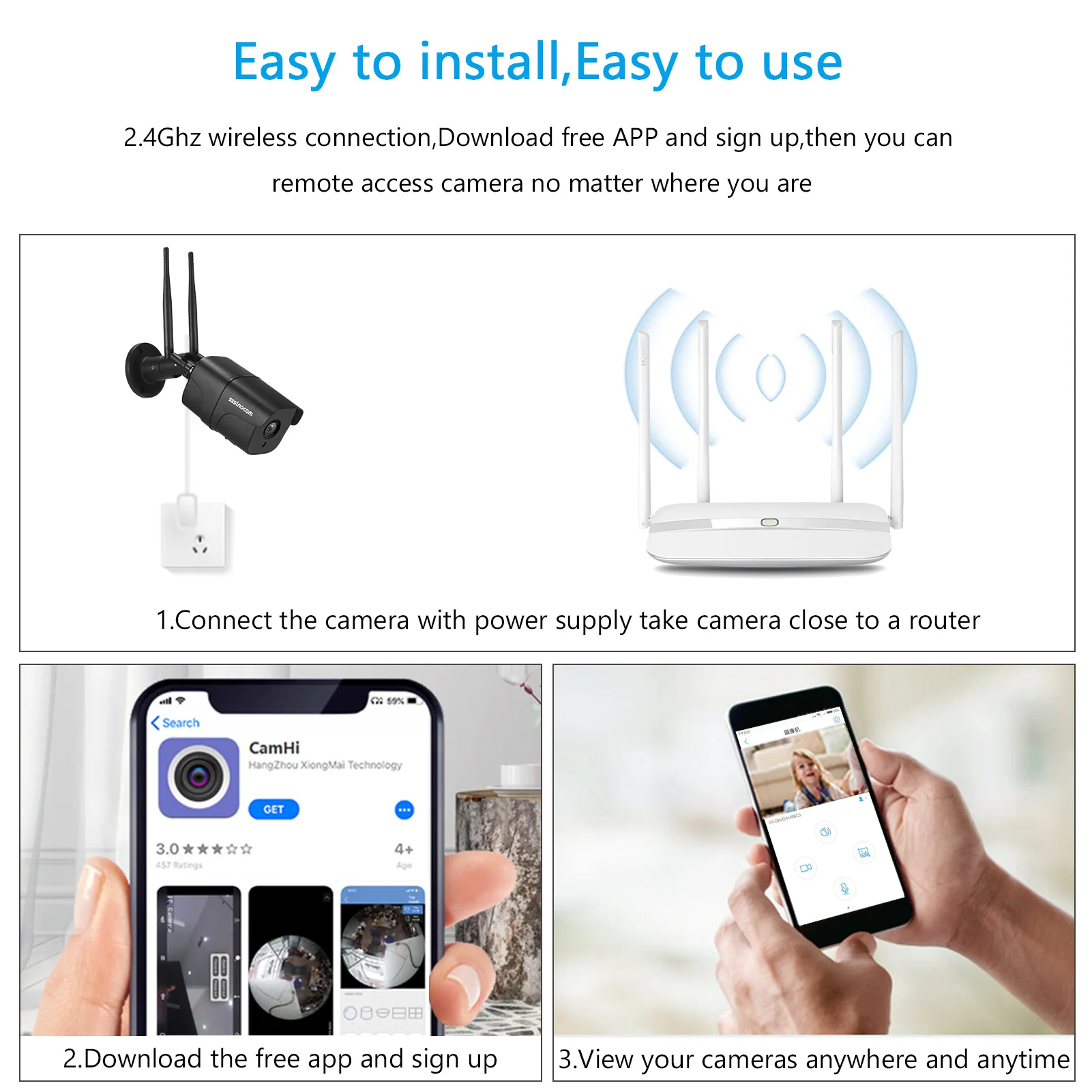 Легкий Удаленный доступ: Камера безопасности позволяет осуществлять удаленный доступ в любое время и в любом месте через ваш смартфон (Android и IOS системы). Загрузите бесплатное приложение, зарегистрируйте новую учетную запись, добавьте идентификатор устройства, затем вы можете просматривать видео по WIFI или сети 3G/4G