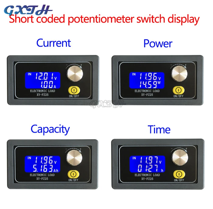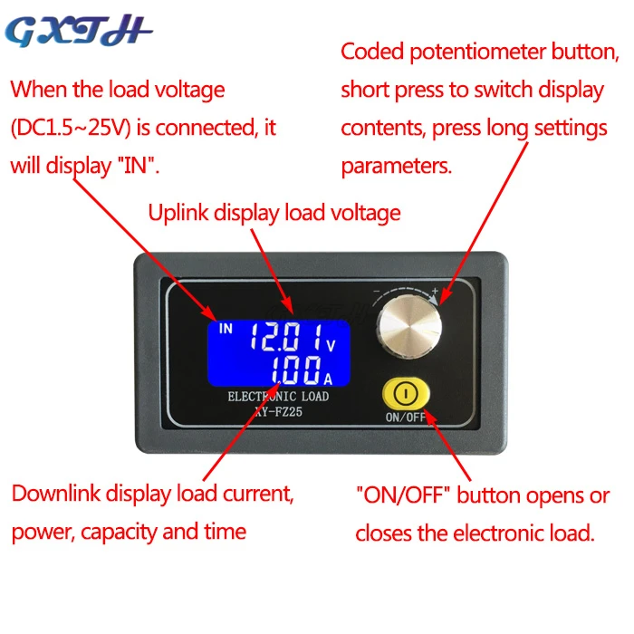 1.Электронная нагрузка включается, а затем входит в операционный интерфейс, который используется для включения или выключения электронной нагрузки при коротком нажатии кнопки «Вкл/Выкл», И изменить ток электронной нагрузки в режиме реального времени путем вращения потенциометра кодировщика;