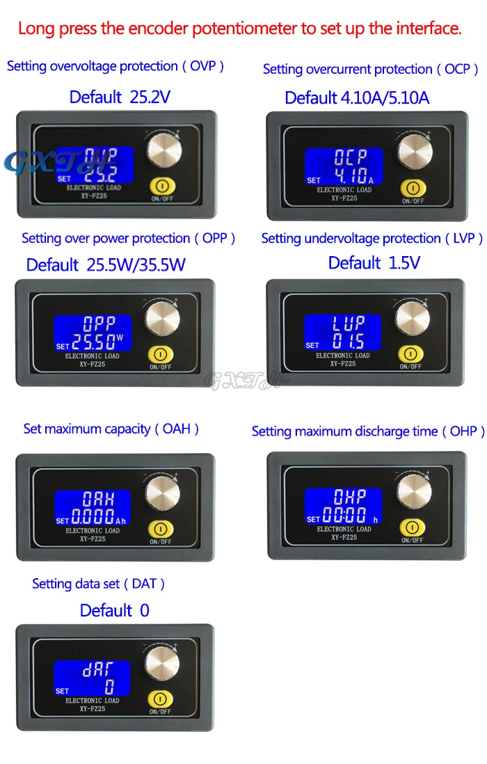 2.Короткое нажатие клавиши кодирующий потенциометр для переключения отображения нисходящего канала (ток/мощность/Емкость/время);