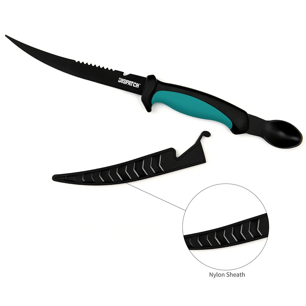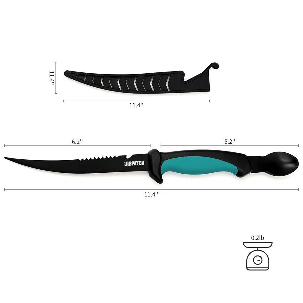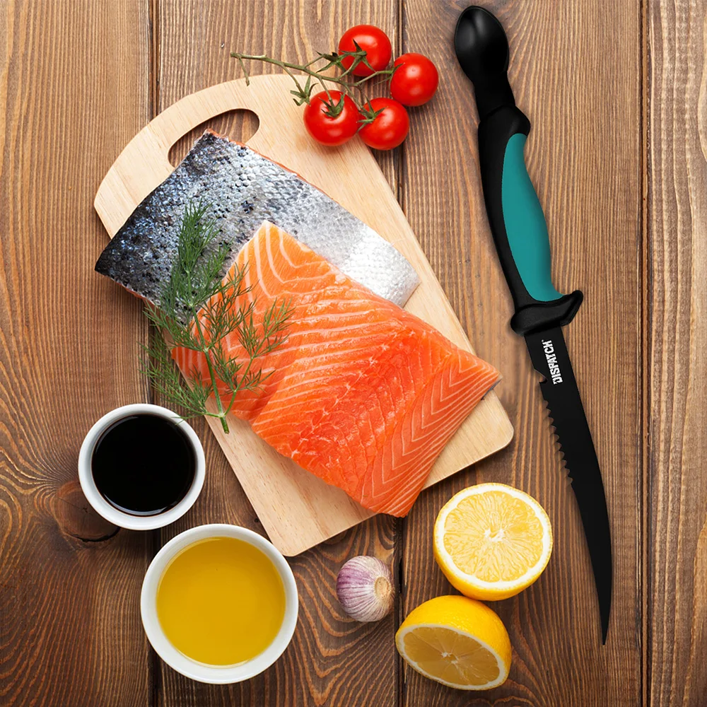 This fishing knive are Durable and Practical, made of stainless steel blade and Solid plastic handle.